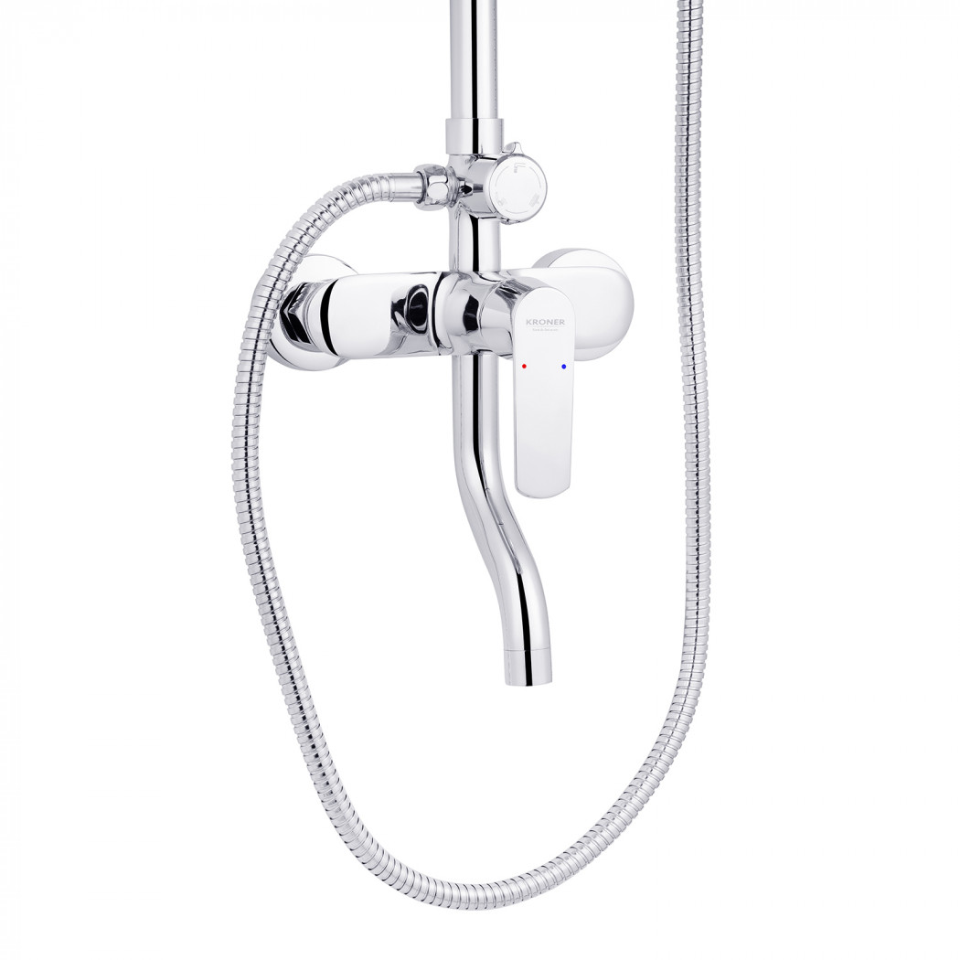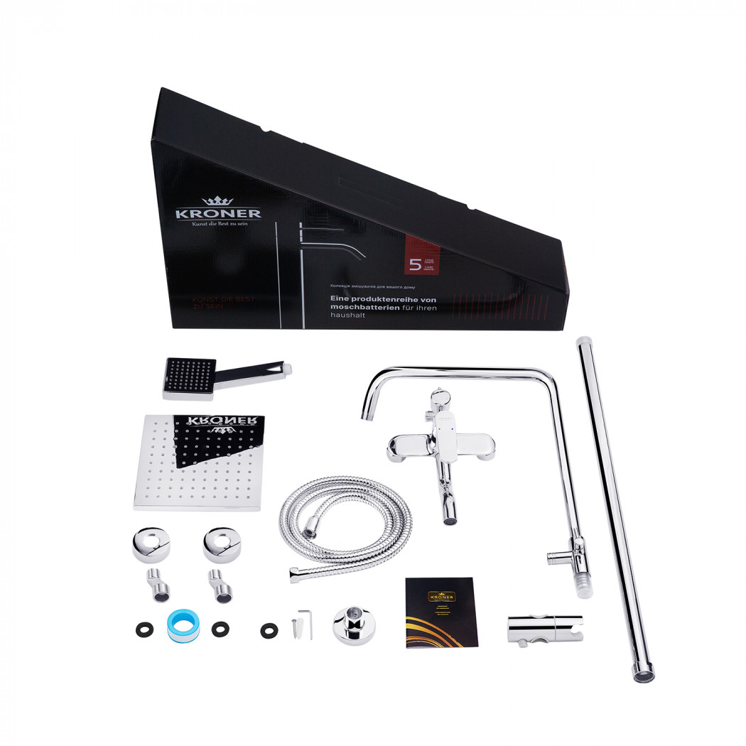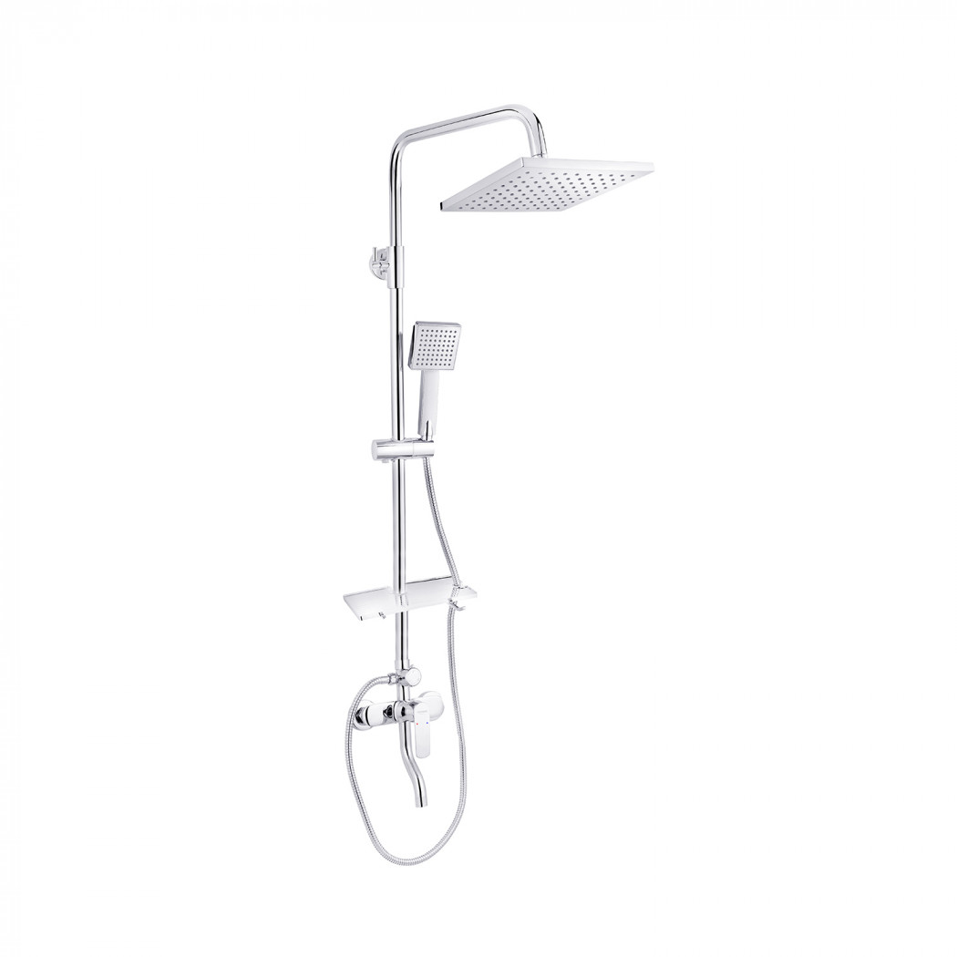 | Комплектація | Змішувач, лійка з кронштейном для верхнього душу, лійка з кронштейном для ручного душу, душовий шланг, душова стійка, кріплення, фум стрічка. |