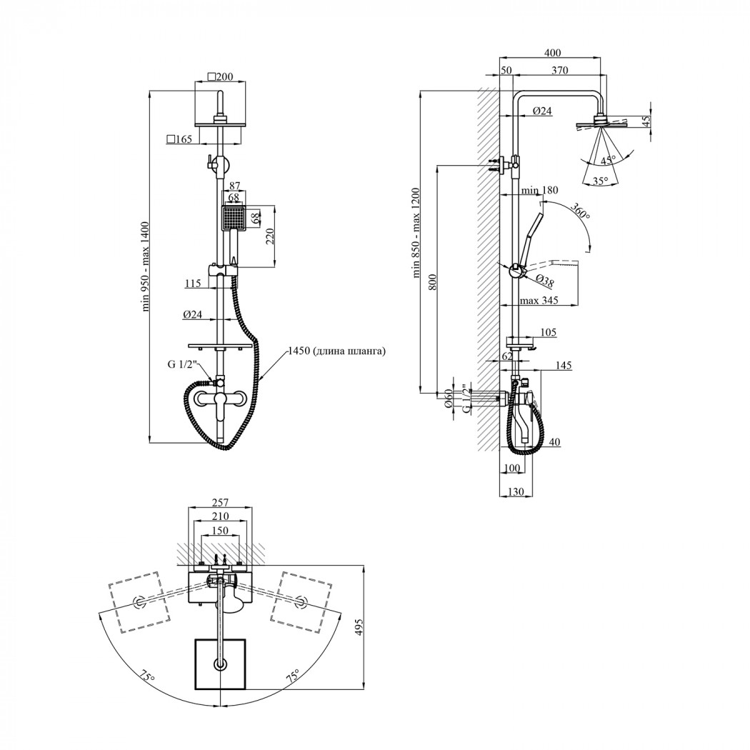 | Довжина кронштейна для верхнього душу, мм | 370 |