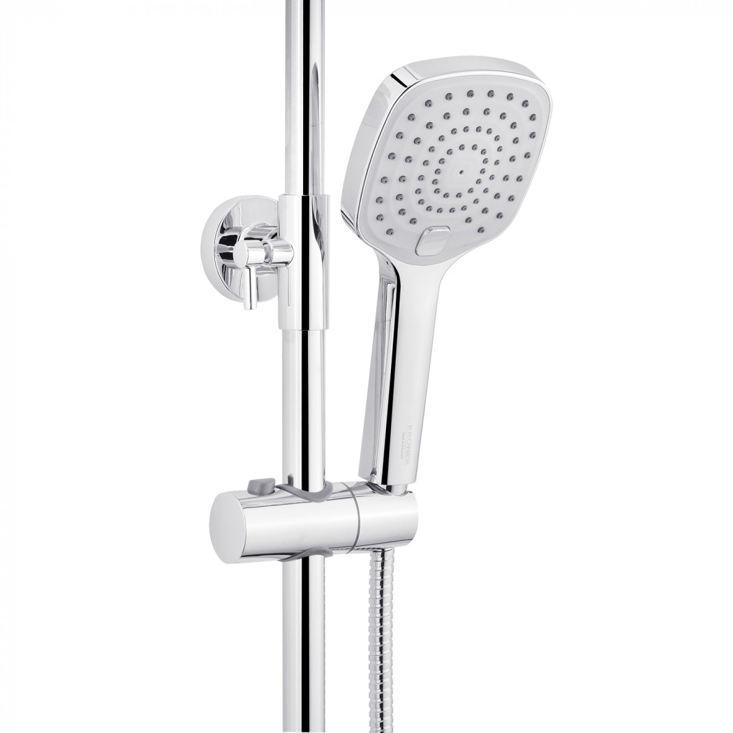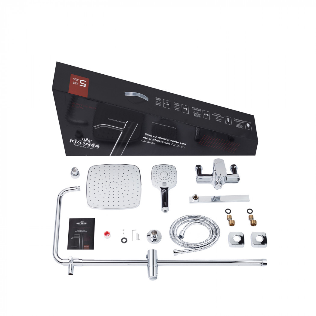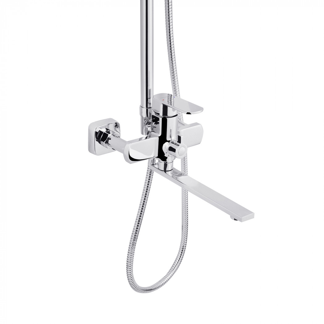 | Комплектація | Змішувач, лійка з кронштейном для верхнього душу, лійка з кронштейном для ручного душу, душовий шланг, душова стійка, кріплення, фум стрічка. |