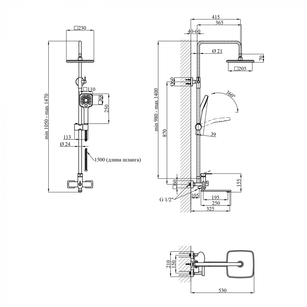 | Довжина кронштейна для верхнього душу, мм | 365 |