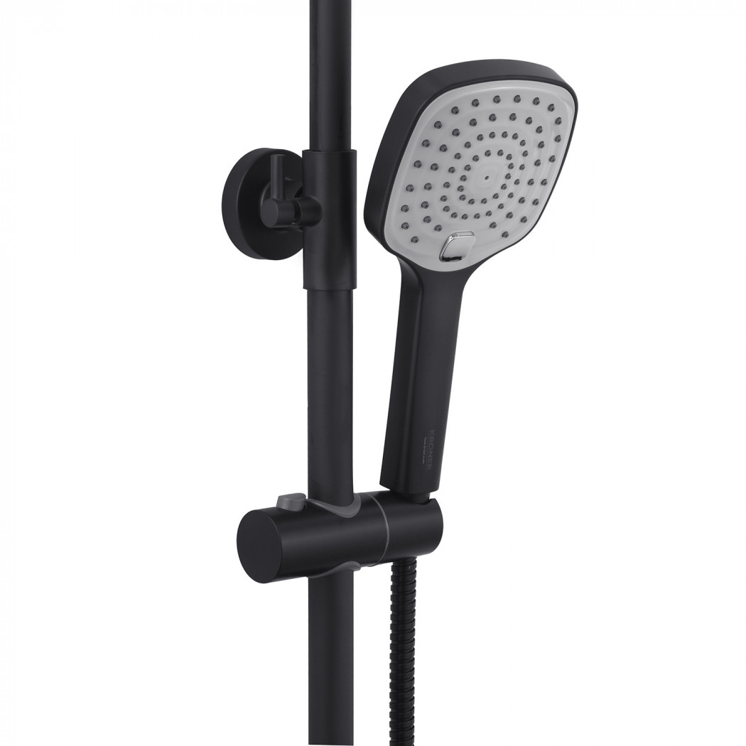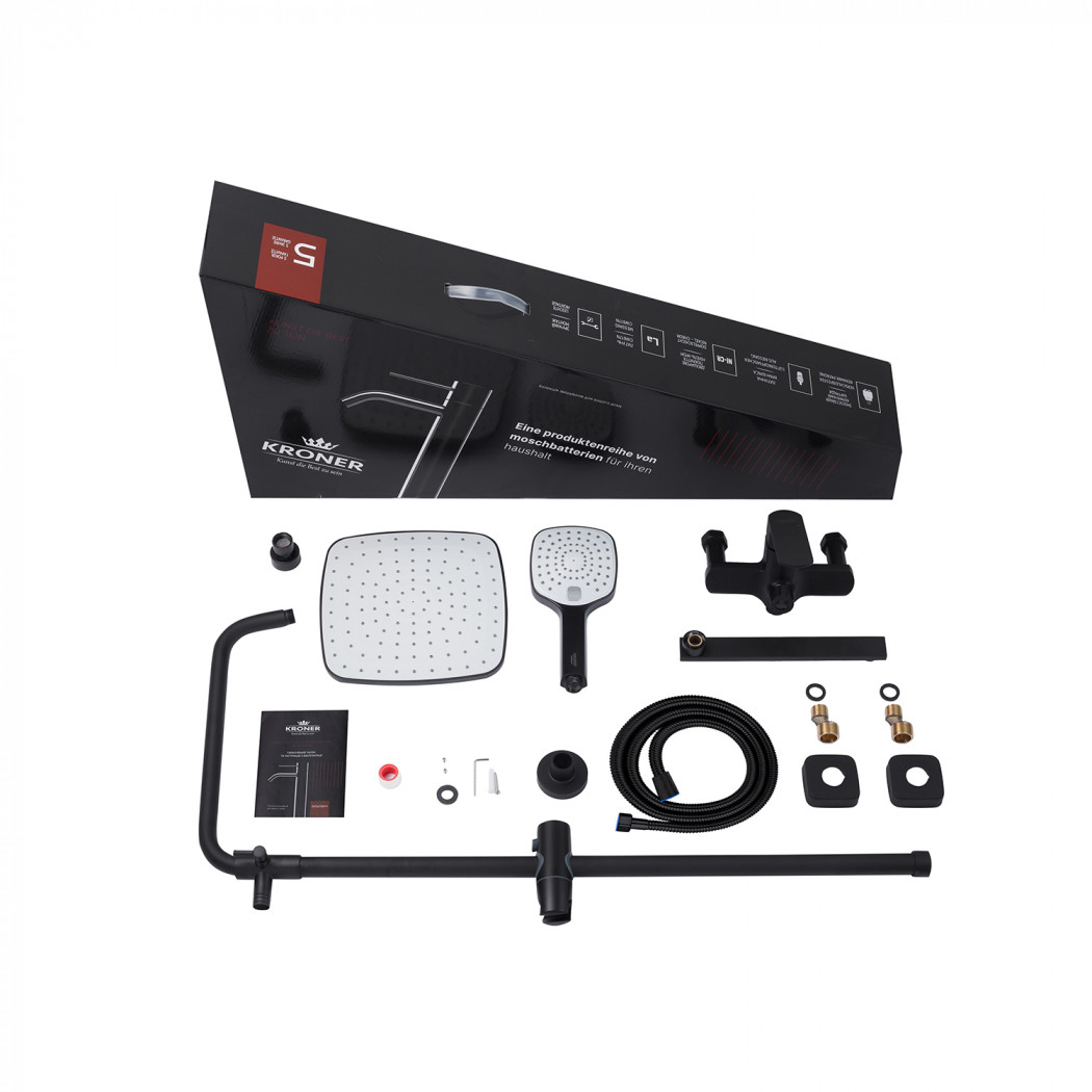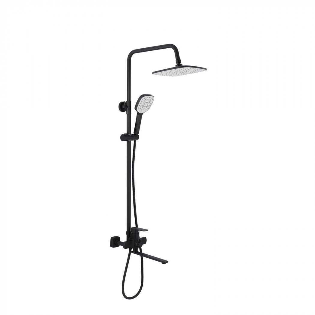 | Комплектація | Змішувач, лійка з кронштейном для верхнього душу, лійка з кронштейном для ручного душу, душовий шланг, душова стійка, кріплення, фум стрічка. |