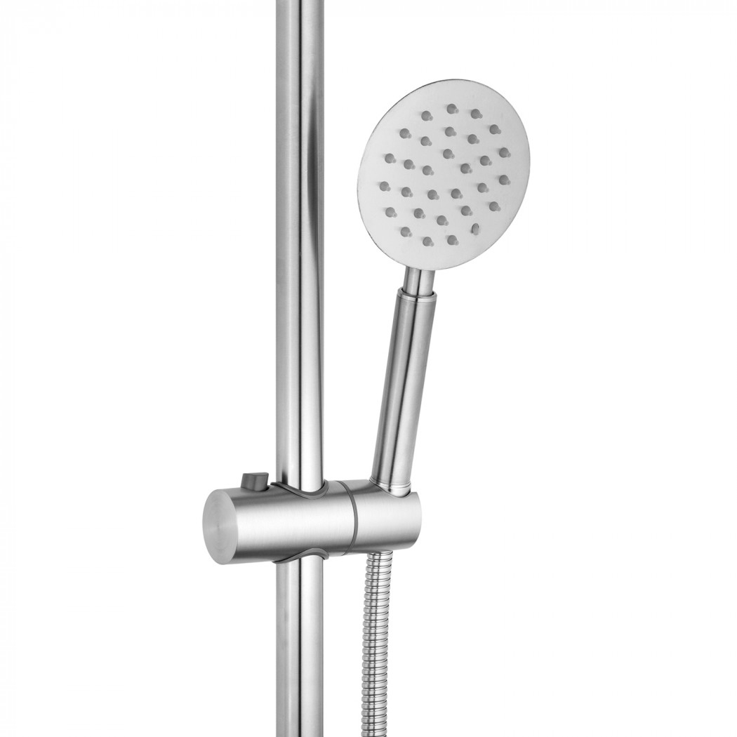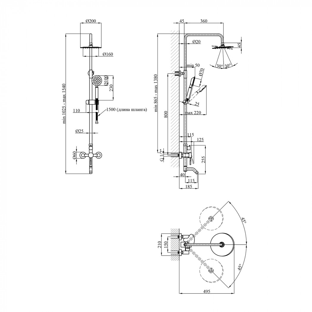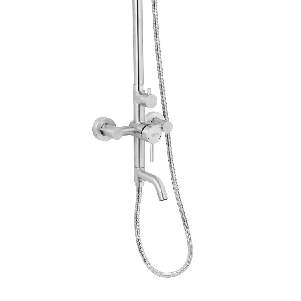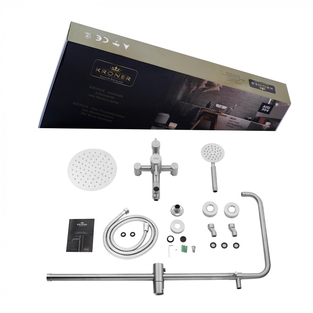 | Комплектація | Змішувач, стійка, кронштейн для верхнього душу, лійка для верхнього душу, кронштейн для ручного душу, лійка для ручного душу, шланг, кріплення. |