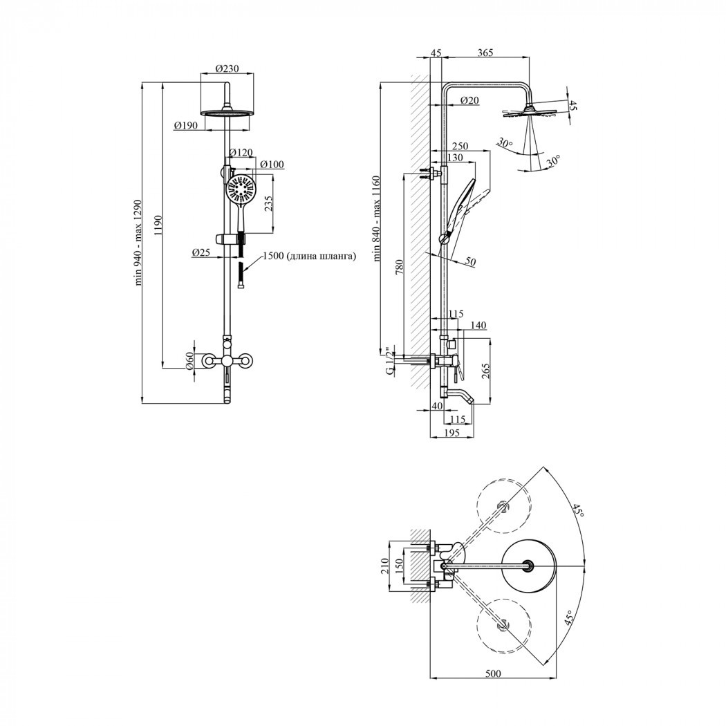 | Висота душової стійки, мм | 840-1160 |