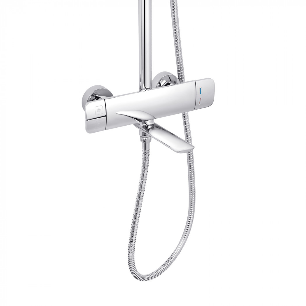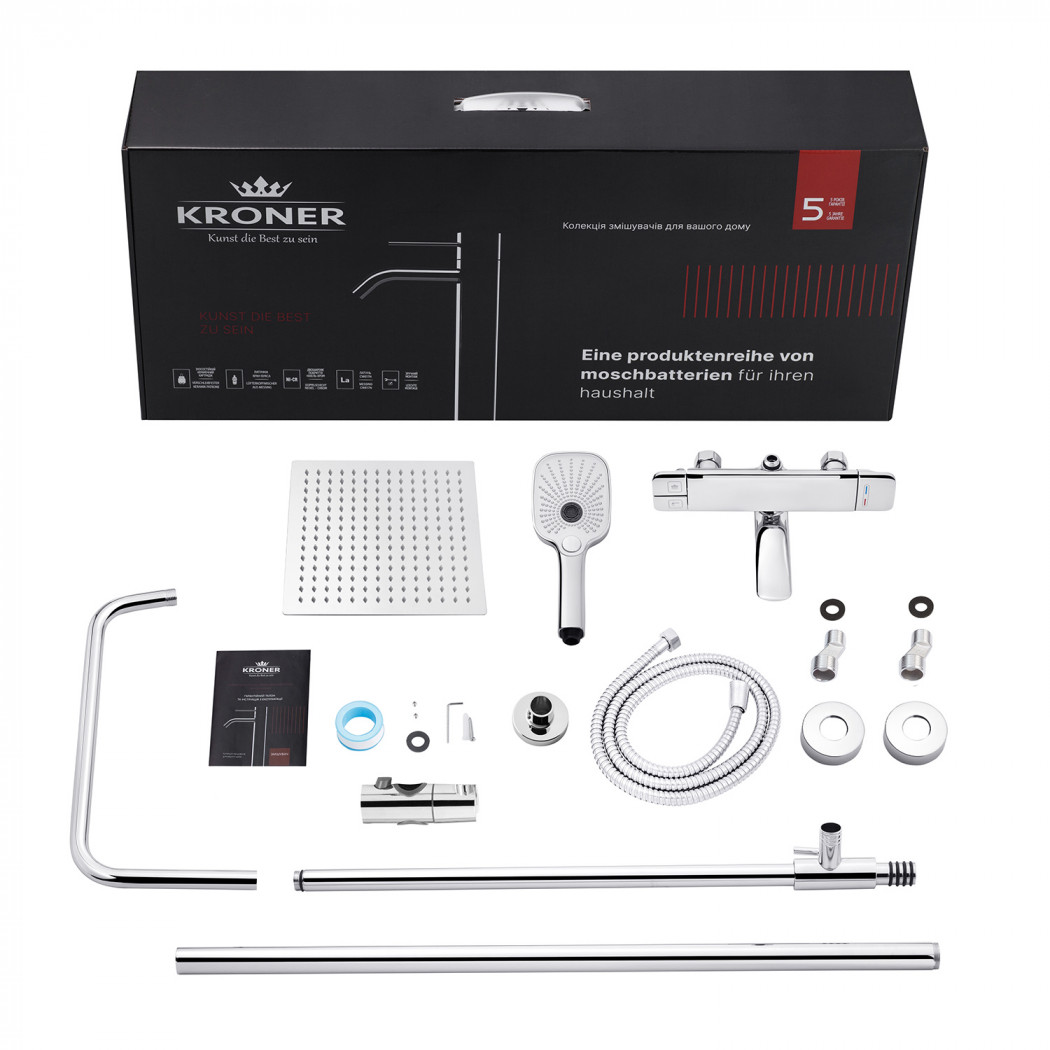 | Комплектація | Змішувач, стійка, кронштейн для верхнього душу, лійка для верхнього душу, кронштейн для ручного душу, лійка для ручного душу, шланг, кріплення. |