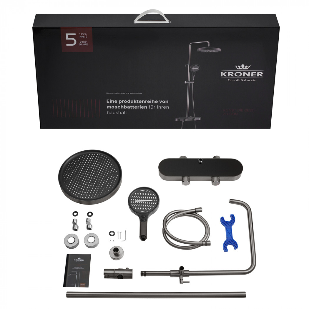 | Комплектація | Змішувач, кронштейн для верхнього душу, лійка для верхнього душу, кронштейн для ручного душу, лійка для ручного душу, душовий шланг, кріплення. |