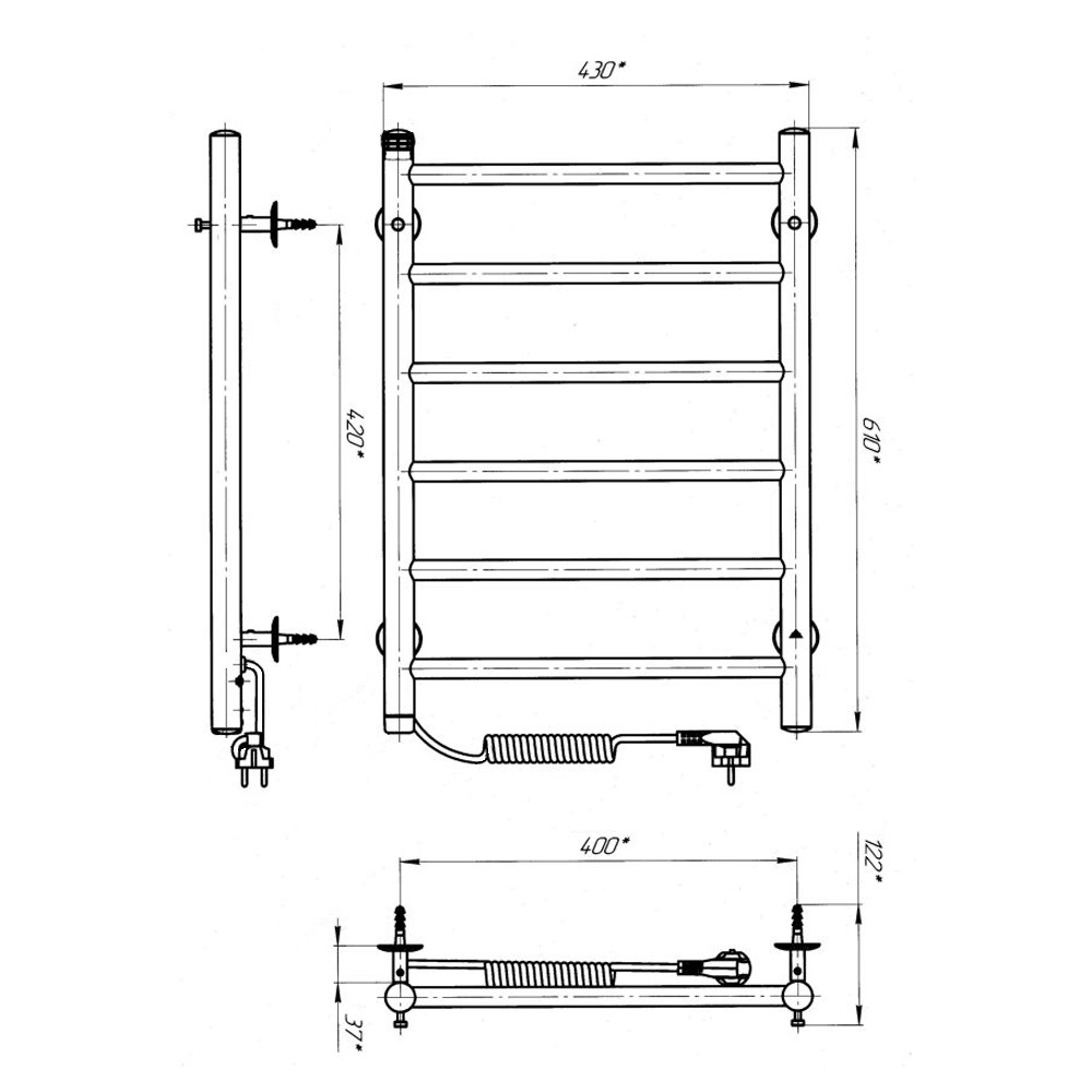Полотенцесушитель - 1 шт, крепление (шуруп оцинкованный с дюбелем, пятак, втулка, штифт, стойка) - 4 шт, ключ шестигранный - 1 шт, упаковка (короб картонный, чехол полиэтиленовый, чехол полиэтиленовый для крепления, коробочка для креплений) - 1 шт, паспорт - 1 шт.