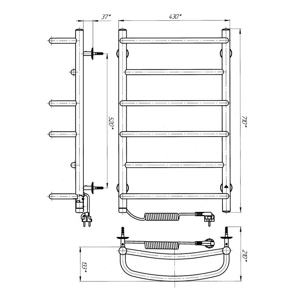 Полотенцесушитель - 1 шт, крепление (шуруп оцинкованный с дюбелем, пятак, втулка, штифт, стойка) - 4 шт, ключ шестигранный - 1 шт, упаковка (короб картонный, чехол полиэтиленовый, чехол полиэтиленовый для крепления, коробочка для креплений) - 1 шт, паспорт - 1 шт.