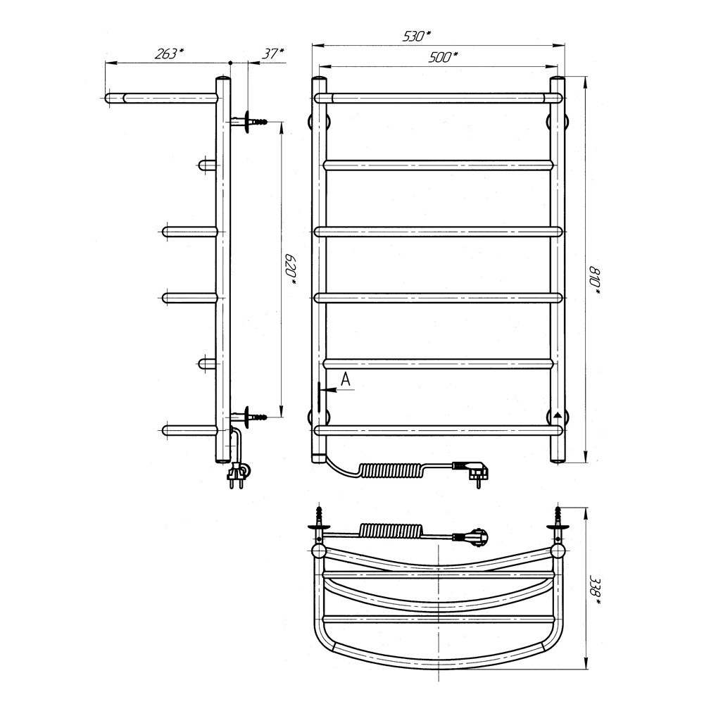 Полотенцесушитель - 1 шт, крепление (шуруп оцинкованный с дюбелем, пятак, втулка, штифт, стойка) - 4 шт, ключ шестигранный - 1 шт, упаковка (короб картонный, чехол полиэтиленовый, чехол полиэтиленовый для крепления, коробочка для креплений) - 1 шт, паспорт - 1 шт.