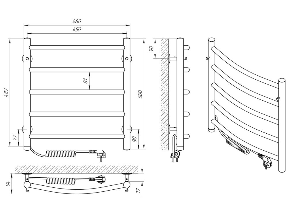 Полотенцесушитель - 1 шт, крепление (шуруп оцинкованный с дюбелем, пятак, втулка, штифт, стойка) - 4 шт, ключ шестигранный - 1 шт, упаковка (короб картонный, чехол полиэтиленовый, чехол полиэтиленовый для крепления, коробочка для креплений) - 1 шт, паспорт - 1 шт.