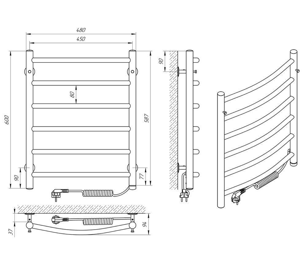 Полотенцесушитель - 1 шт, крепление (шуруп оцинкованный с дюбелем, пятак, втулка, штифт, стойка) - 4 шт, ключ шестигранный - 1 шт, упаковка (короб картонный, чехол полиэтиленовый, чехол полиэтиленовый для крепления, коробочка для креплений) - 1 шт, паспорт - 1 шт.