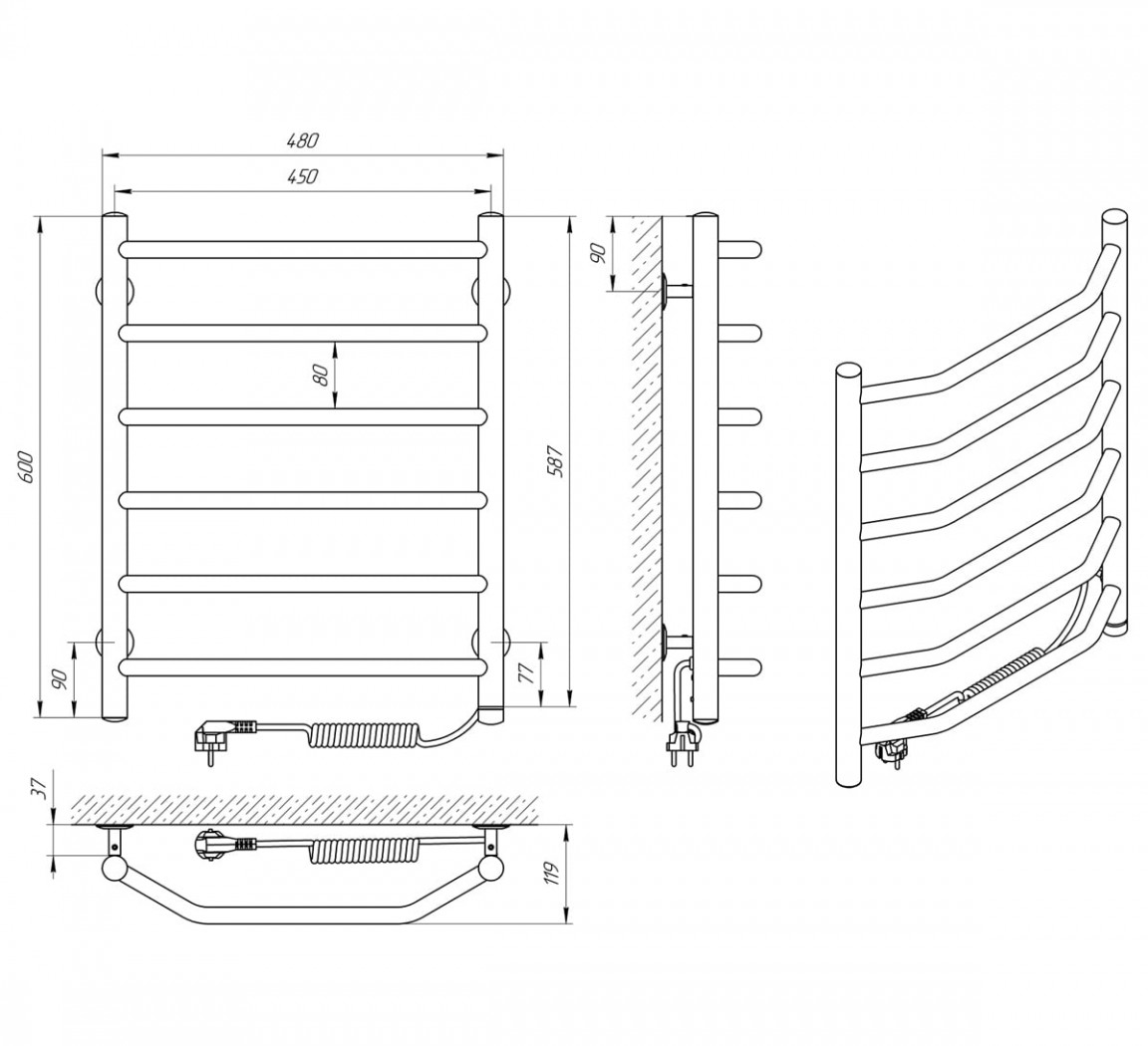 Полотенцесушитель - 1 шт, крепление (шуруп оцинкованный с дюбелем, пятак, втулка, штифт, стойка) - 4 шт, ключ шестигранный - 1 шт, упаковка (короб картонный, чехол полиэтиленовый, чехол полиэтиленовый для крепления, коробочка для креплений) - 1 шт, паспорт - 1 шт.