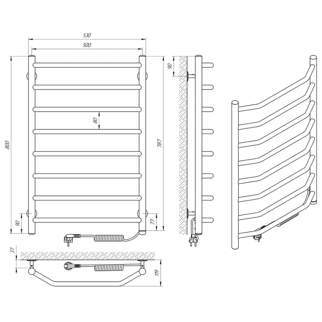 Полотенцесушитель - 1 шт, крепление (шуруп оцинкованный с дюбелем, пятак, втулка, штифт, стойка) - 4 шт, ключ шестигранный - 1 шт, упаковка (короб картонный, чехол полиэтиленовый, чехол полиэтиленовый для крепления, коробочка для креплений) - 1 шт, паспорт - 1 шт.