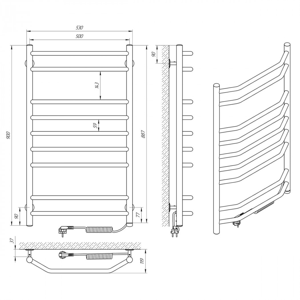 Полотенцесушитель - 1 шт, крепление (шуруп оцинкованный с дюбелем, пятак, втулка, штифт, стойка) - 4 шт, ключ шестигранный - 1 шт, упаковка (короб картонный, чехол полиэтиленовый, чехол полиэтиленовый для крепления, коробочка для креплений) - 1 шт, паспорт - 1 шт.