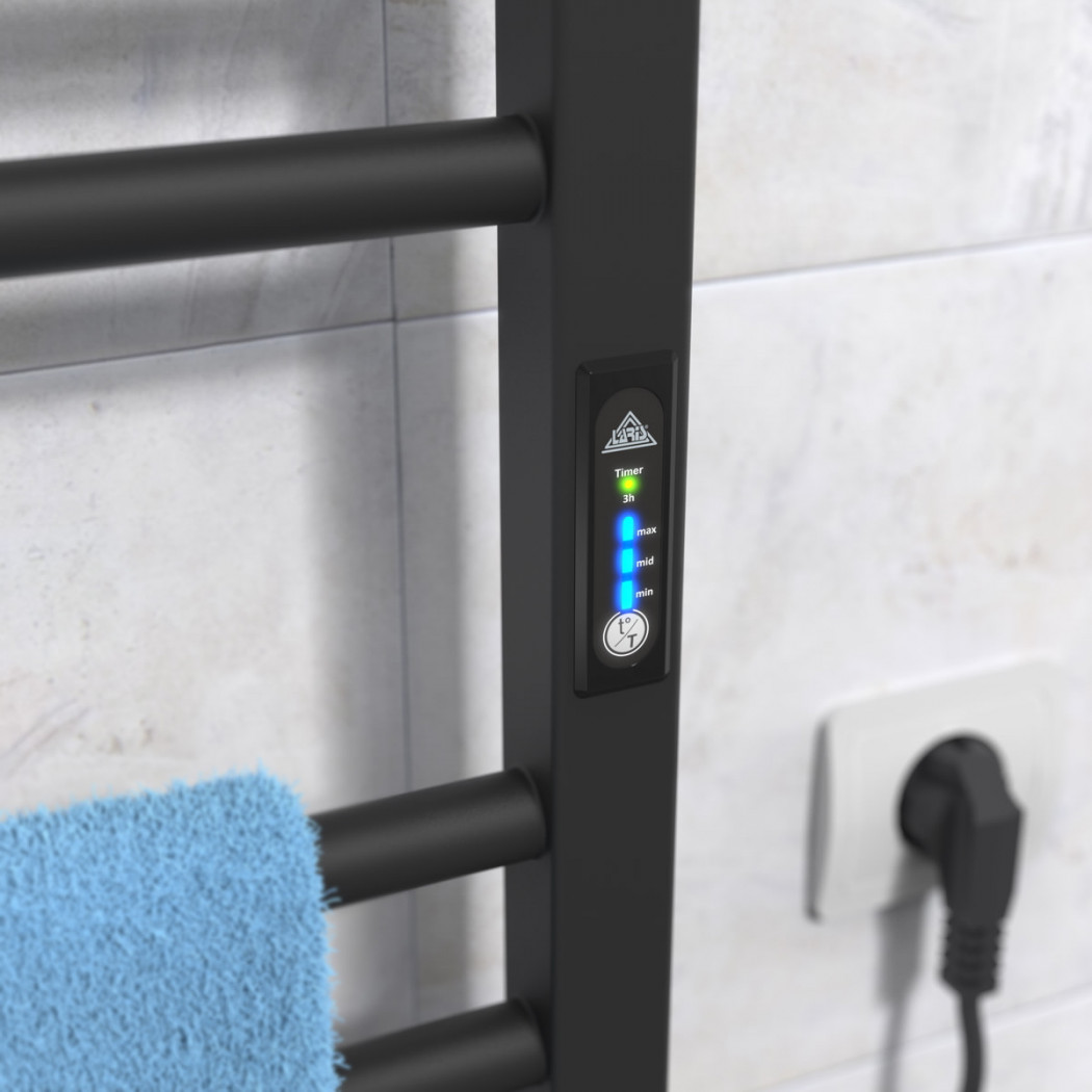 Особенности: управляет нагревом электрополотенцесушителя микропроцессорный термоконтроллер (кнопочное управление). Для начала работы необходимо задать температуру полотенцесушителя. Термодатчик контролирует температуру поверхности полотенцесушителя, что исключает его перегрев. Среди преимуществ регулятора - хранения избранного режима работы (при отключении работа восстановиться в запрограммированном пользователем режиме), наличие таймера отключения (3h) и цветовой индикации работы!