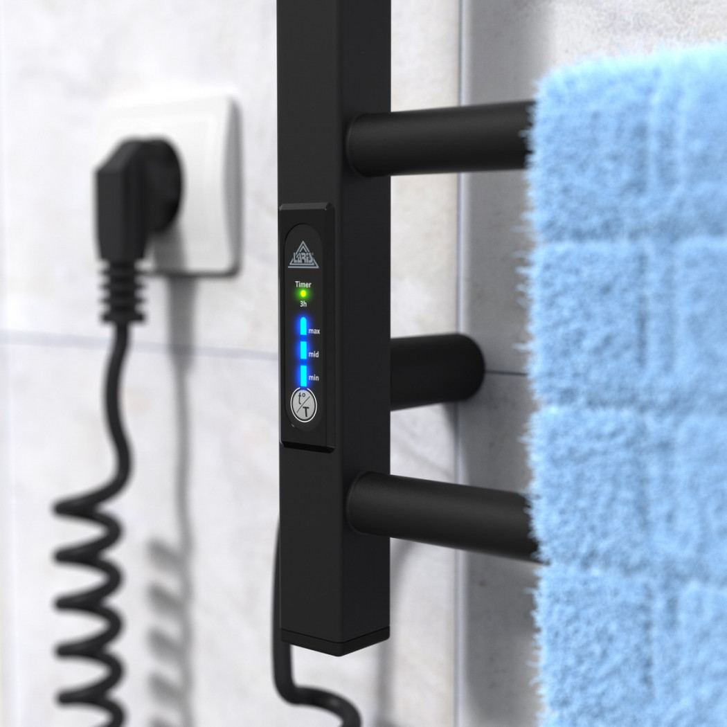 Особенности: управляет нагревом электрополотенцесушителя микропроцессорный термоконтроллер (кнопочное управление). Для начала работы необходимо задать температуру полотенцесушителя. Термодатчик контролирует температуру поверхности полотенцесушителя, что исключает его перегрев. Среди преимуществ регулятора - хранения избранного режима работы (при отключении работа восстановиться в запрограммированном пользователем режиме), наличие таймера отключения (3h) и цветовой индикации работы!