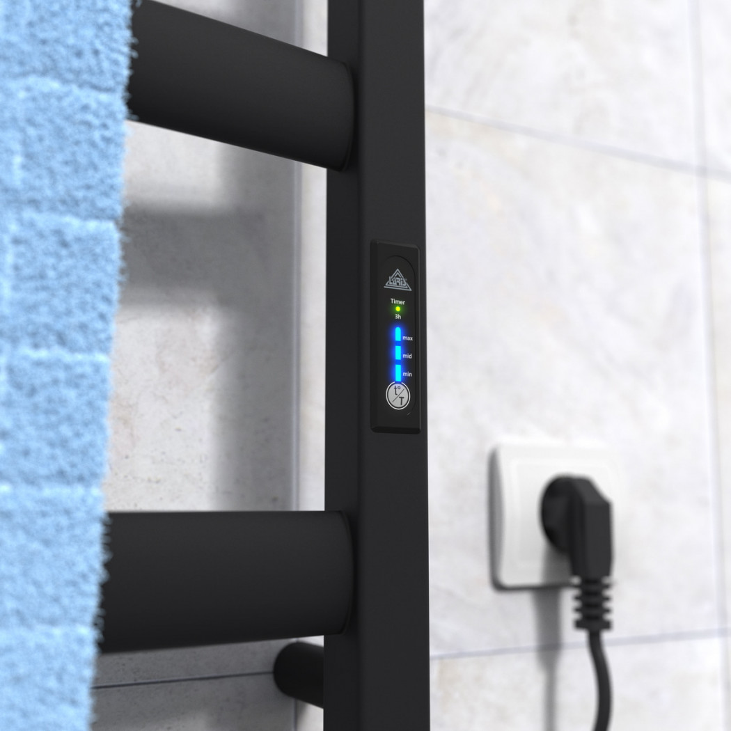 Особенности: управляет нагревом электрополотенцесушителя микропроцессорный термоконтроллер (кнопочное управление). Для начала работы необходимо задать температуру полотенцесушителя. Термодатчик контролирует температуру поверхности полотенцесушителя, что исключает его перегрев. Среди преимуществ регулятора - хранения избранного режима работы (при отключении работа восстановиться в запрограммированном пользователем режиме), наличие таймера отключения (3h) и цветовой индикации работы!