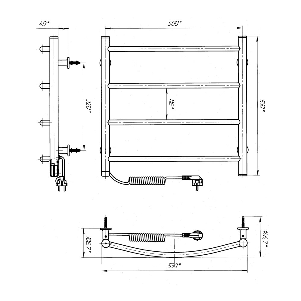 Полотенцесушитель - 1 шт, крепление (шуруп оцинкованный с дюбелем, пластиковое крепление, резьбовая втулка, штифт) - 4 шт, ключ шестигранный - 1 шт, упаковка (короб картонный, чехол полиэтиленовый, чехол полиэтиленовый для крепления, коробочка для креплений) - 1 шт, паспорт - 1 шт.