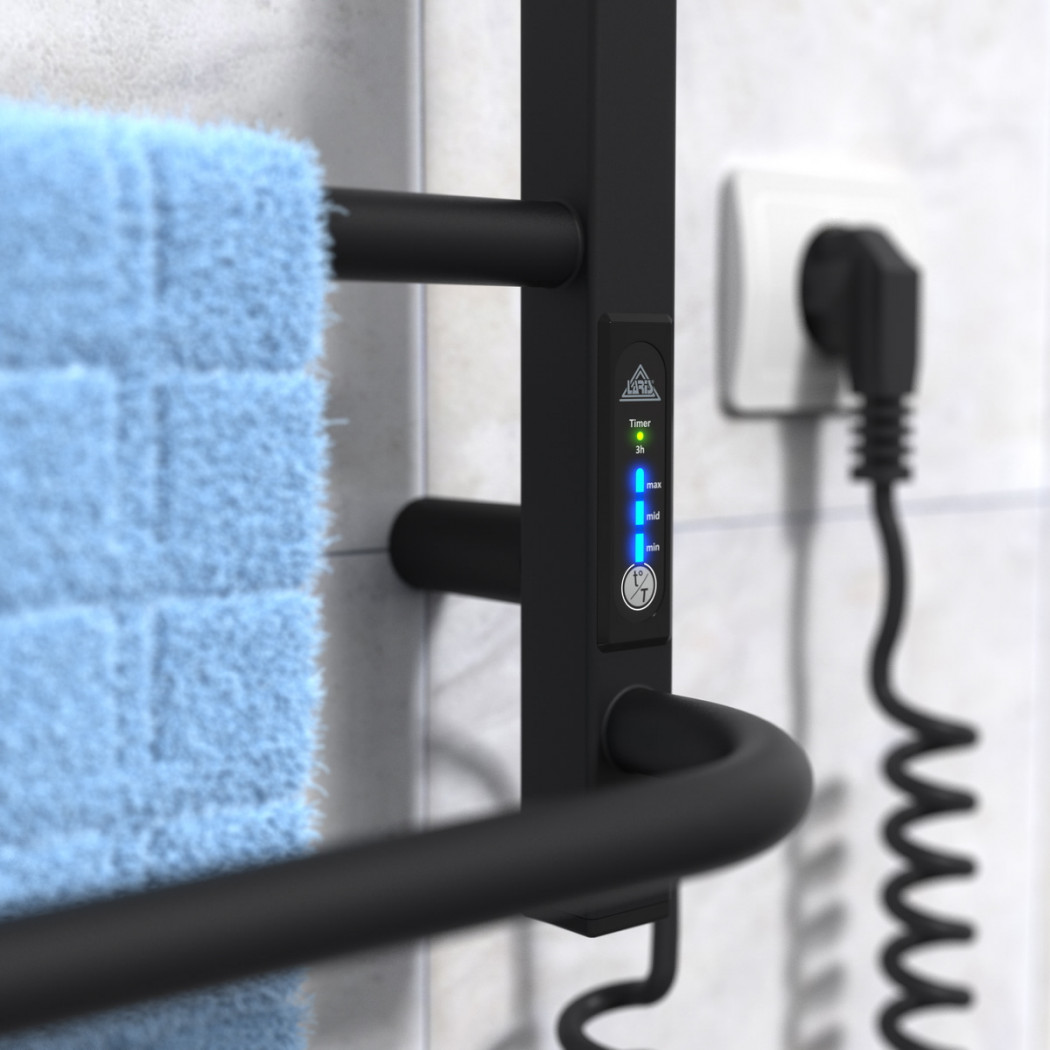 Особенности: управляет нагревом электрополотенцесушителя микропроцессорный термоконтроллер (кнопочное управление). Для начала работы необходимо задать температуру полотенцесушителя. Термодатчик контролирует температуру поверхности полотенцесушителя, что исключает его перегрев. Среди преимуществ регулятора - хранения избранного режима работы (при отключении работа восстановиться в запрограммированном пользователем режиме), наличие таймера отключения (3h) и цветовой индикации работы!