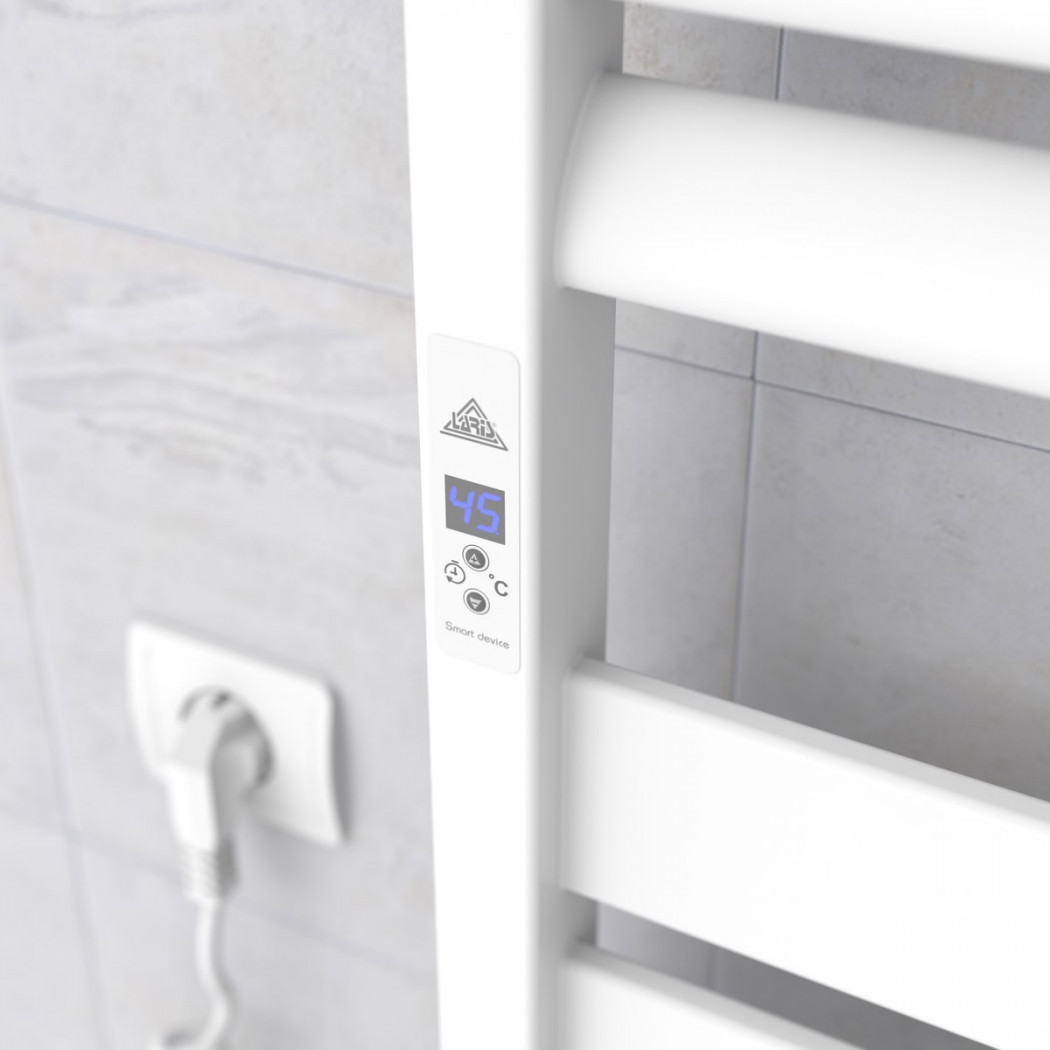 Особенности: управляет нагревом электрополотенцесушителя микропроцессорный термоконтроллер. Для начала работы необходимо задать температуру полотенцесушителя. Дополнительно можно включать/выключать нагрев, программно снижать мощность до 50%. Термостат контролирует температуру поверхности полотенцесушителя, что исключает его перегрев. Выдерживает напряжение 1500 В переменного тока/минуту. Есть удобная функция блокировки кнопок от детей.