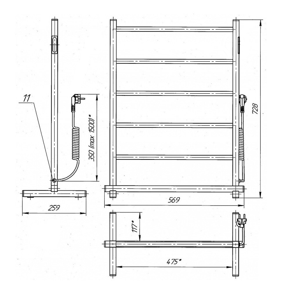 | Размещение шнура | Слева / справа (повернуть полотенцесушитель на 180°) |