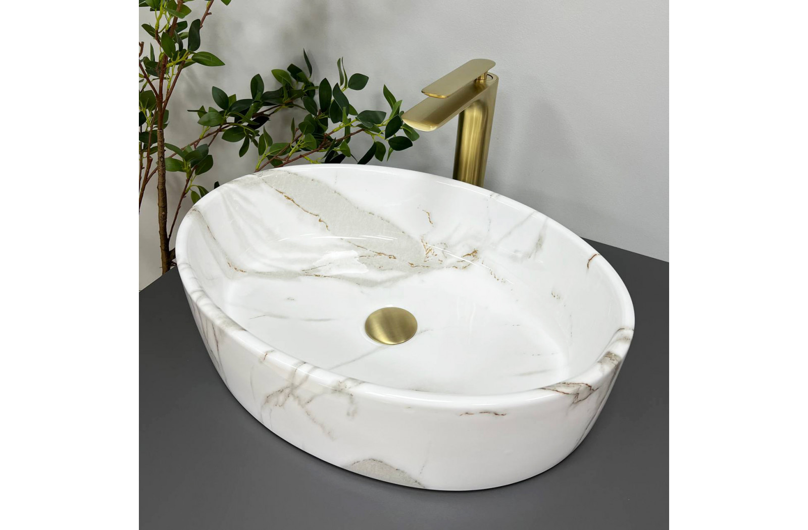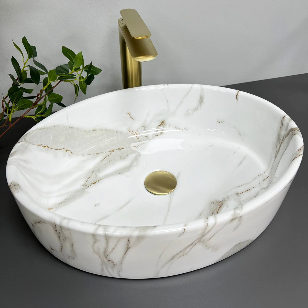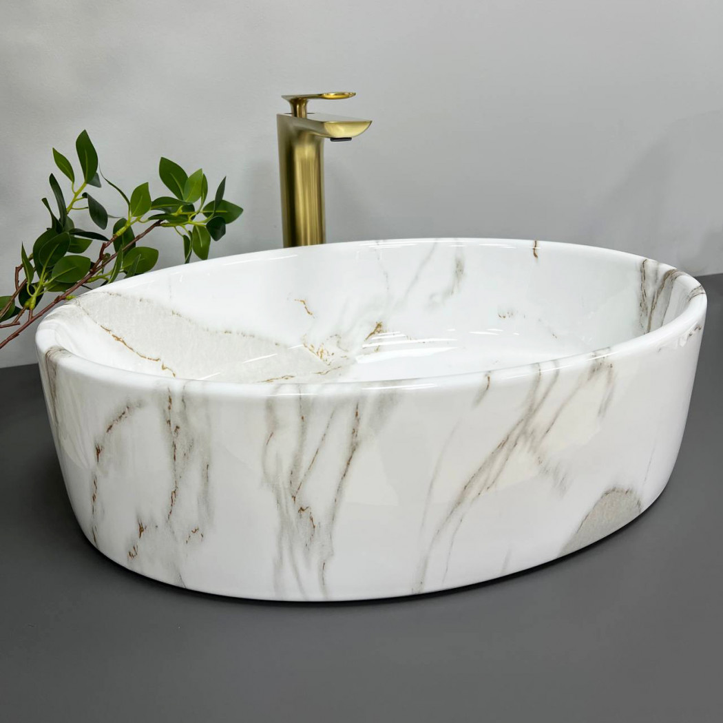 Накладные раковины серии VBI CEFALU пользуются высоким спросом и доступны в разных цветах в глянцевом или матовом исполнении. Накладная по способу установки раковина имеет современную овальную форму и высокие прямые стенки. Это позволяет подобрать смеситель, как круглой, так и квадратной формы. Модель VBI CEFALU AIAX – имеет уникальный узор, который имитирует мрамор, а матовое покрытие придает общий шарм.