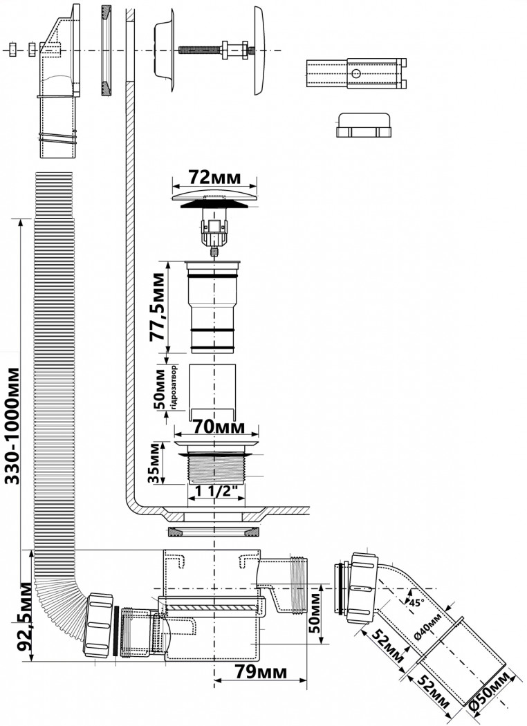 • телескопическая переливная трубка длиной до 1000 мм для адаптации к различной глубине ванн и поддонов;