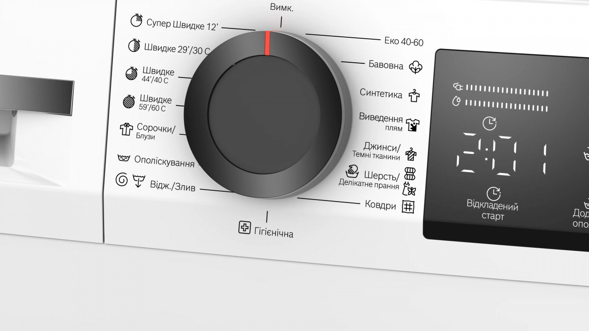 | Програми | Еко 40-60, Бавовна, Синтетика, Виведення плям, Джинси, Вовна, Ковдри, Гігієнічна, Супер Швидка 12', Швидка 29'/30С, Швидка 44'/40С, Швидка 59'/60С, Сорочки, Ополіскування, ВіджимЗлив |