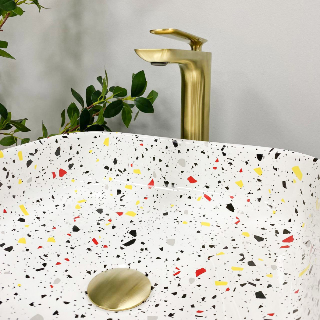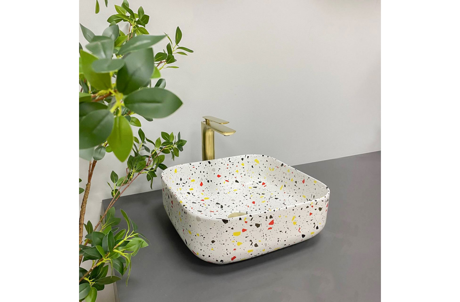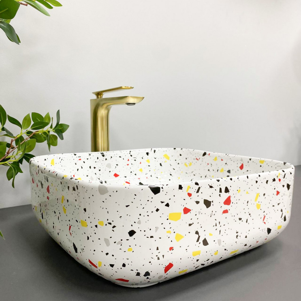 Накладные раковины серии VBI ALGHERO пользуются высоким спросом и доступны в разных цветах в матовом и глянцевом исполнении. Раковина имеет невероятную квадратную форму с закруглениями. Накладная по способу установки раковина изготовлена из высококачественной керамики. Модель VBI ALGHERO TERAZZO имеет уникальный узор. В основе есть белый цвет, украшенный хаотическими, цветными пятнышками это придает раковине яркий характер.