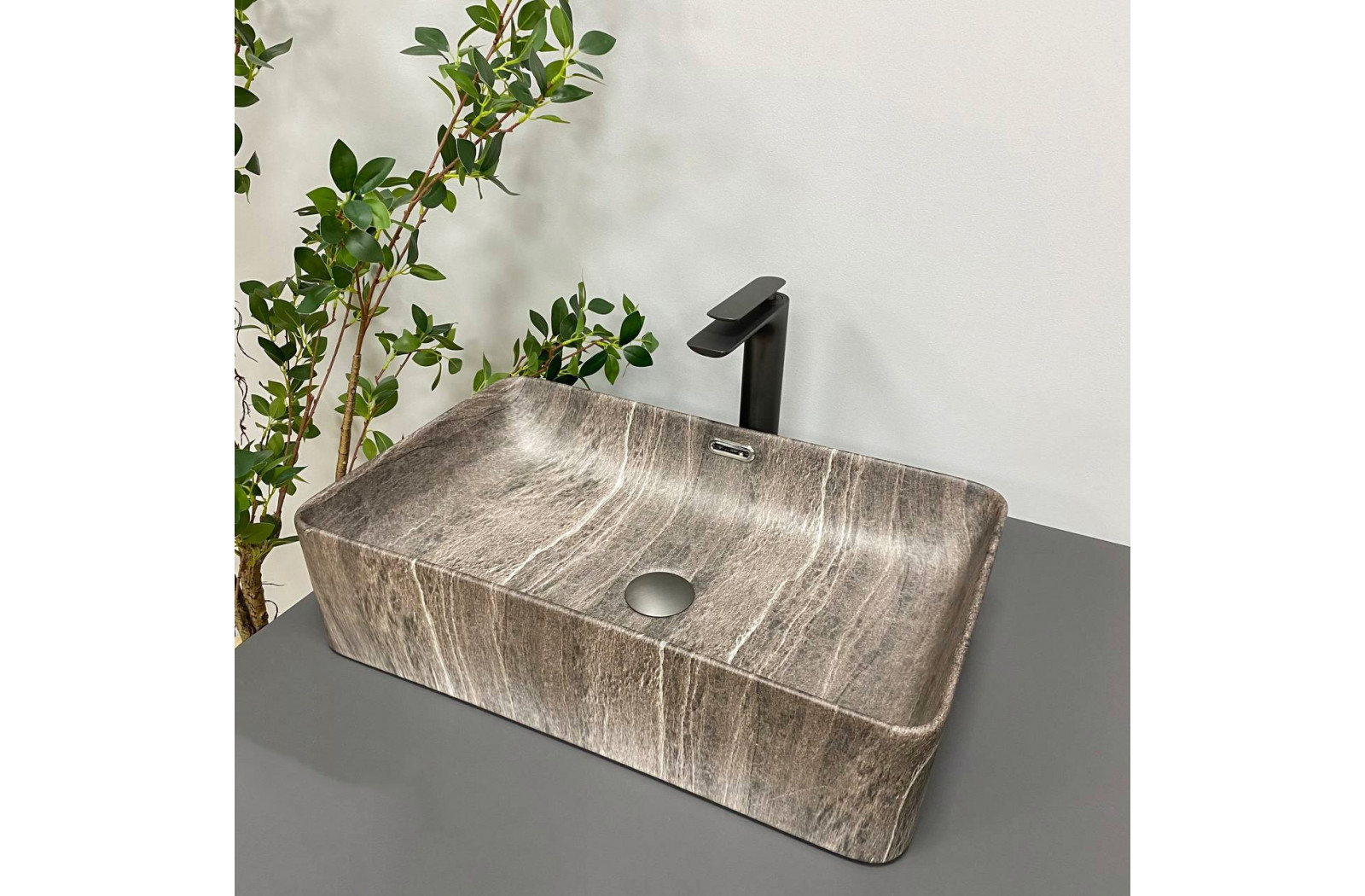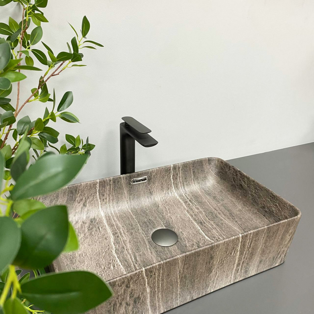 Накладные раковины серии VBI ARABBA пользуются высоким спросом и доступны в разных цветах в матовом исполнении. Раковина имеет прямоугольную форму, которая внутри смягчается изгибами, что значительно облегчает уход. Оснащенная отверстием для перелива ты изготовлена из высококачественной керамики. Модель VBI ARABBA DARK STONE имеет уникальный узор с матовым покрытием.