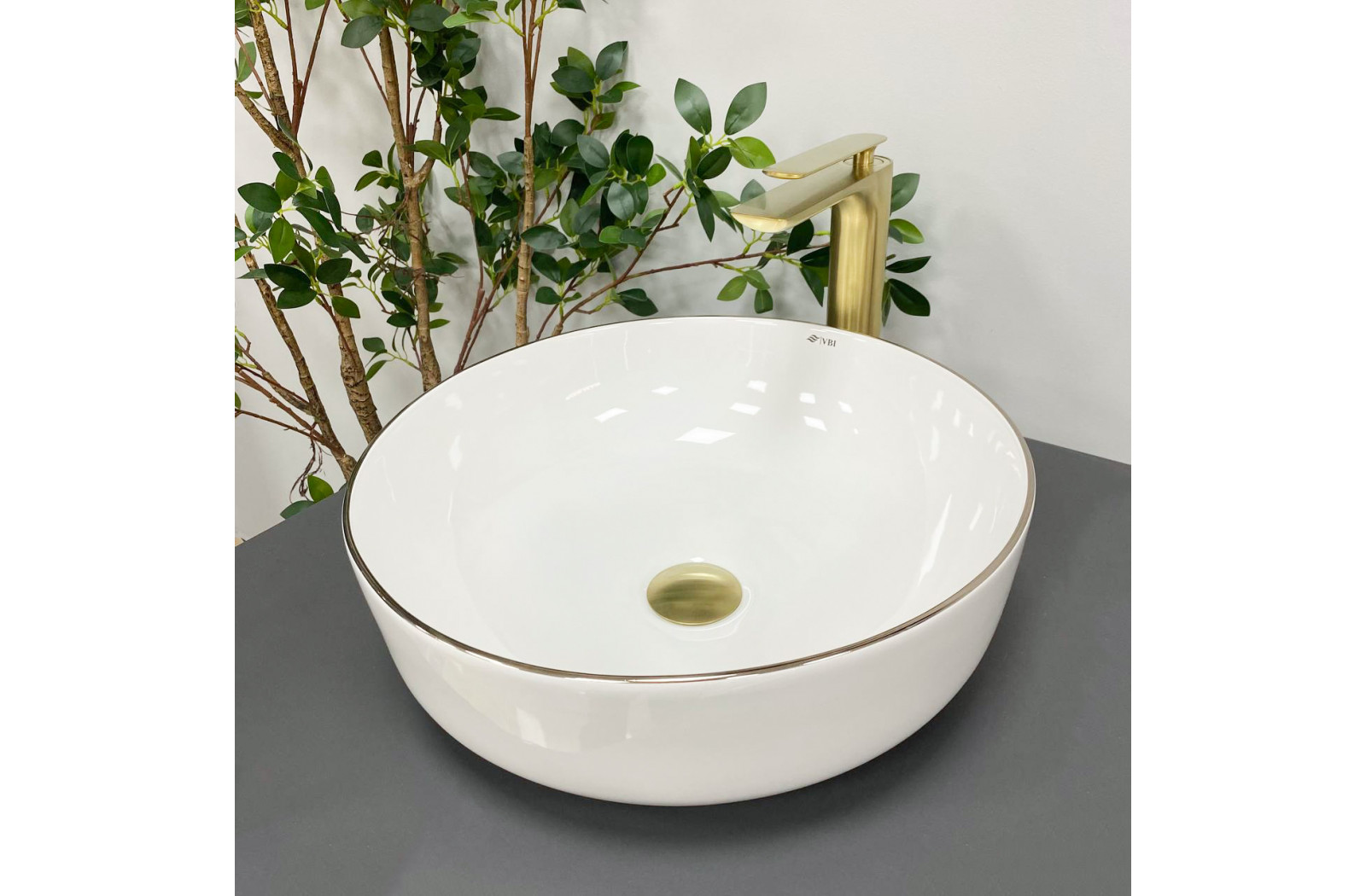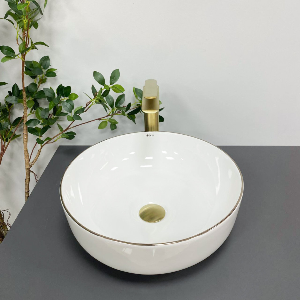 Накладные раковины серии VBI BARI пользуются высоким спросом и доступны в разных цветах в глянцевом или матовом исполнении. Изящный ободок с прямыми стенками и деликатное закругление у основания придают раковине легкости. А идеальная круглая форма раковины усиляет непревзойденный вид. Модель VBI BARI S WHITE GOLD EDGE – выполнена в белом цвете, а глянцевое покрытие отражает свет, придавая яркости.