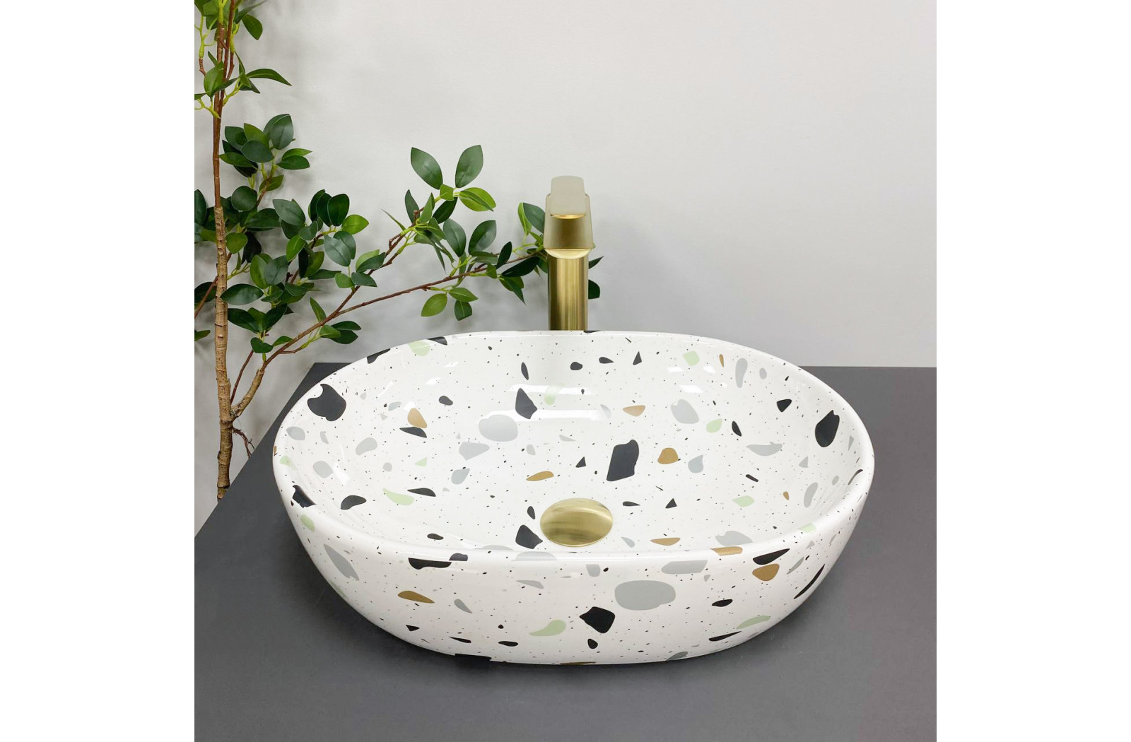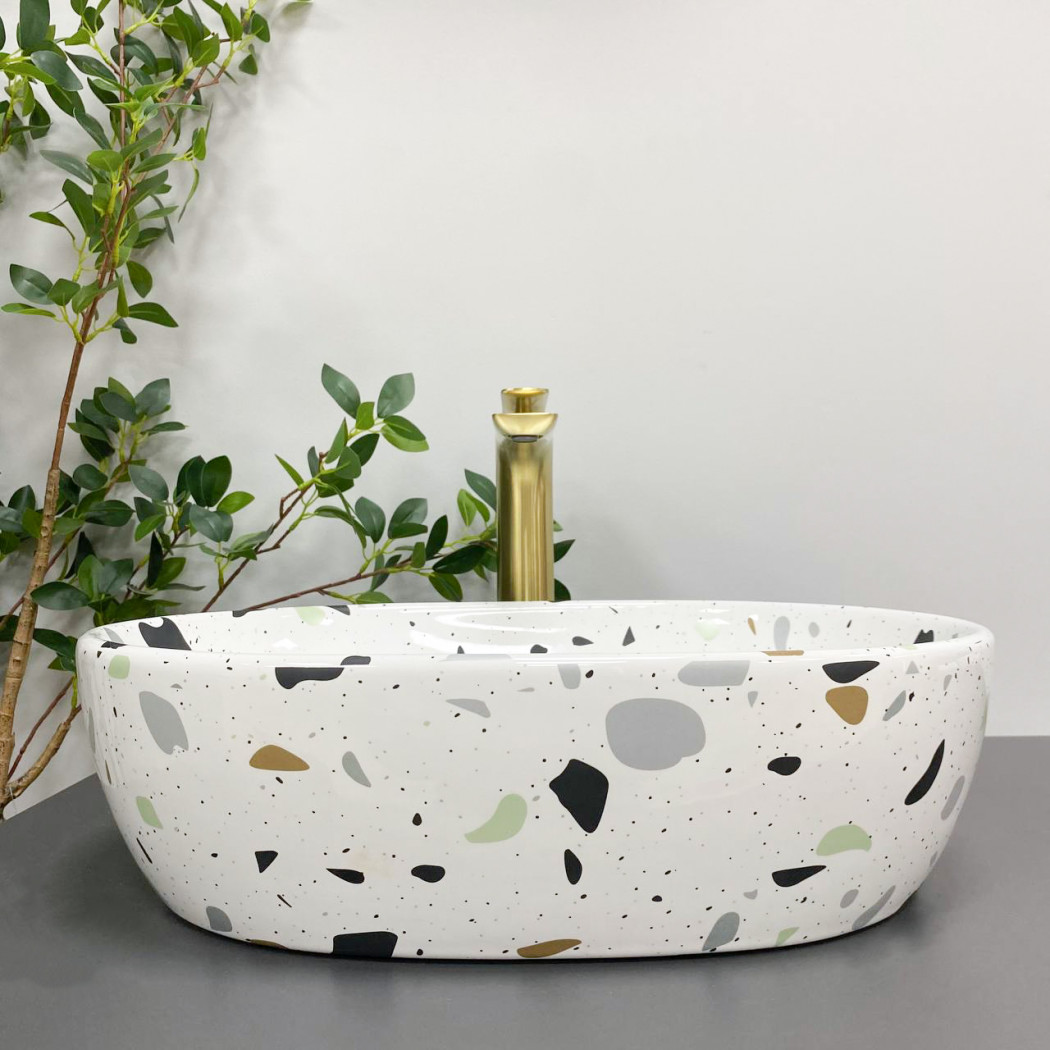 Накладные раковины серии VBI MODENA пользуются высоким спросом и доступны в разных размерах и разных цветах в глянцевом или матовом исполнении. Изготовлена из высококачественной керамики и имеет овальную форму с гладкой поверхностью. Раковина отличается современным дизайном и закругленным силуэтом, что придает уникальность и утонченность. Модель VBI MODENA TERAZZO имеет уникальный узор. В основе есть белый цвет, украшенный хаотическими, цветными пятнышками это придает раковине яркий характер.