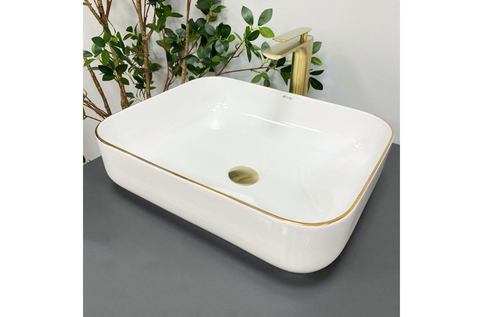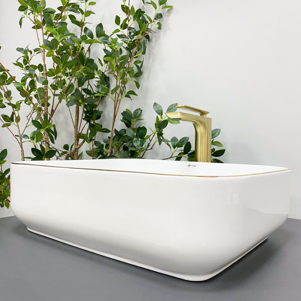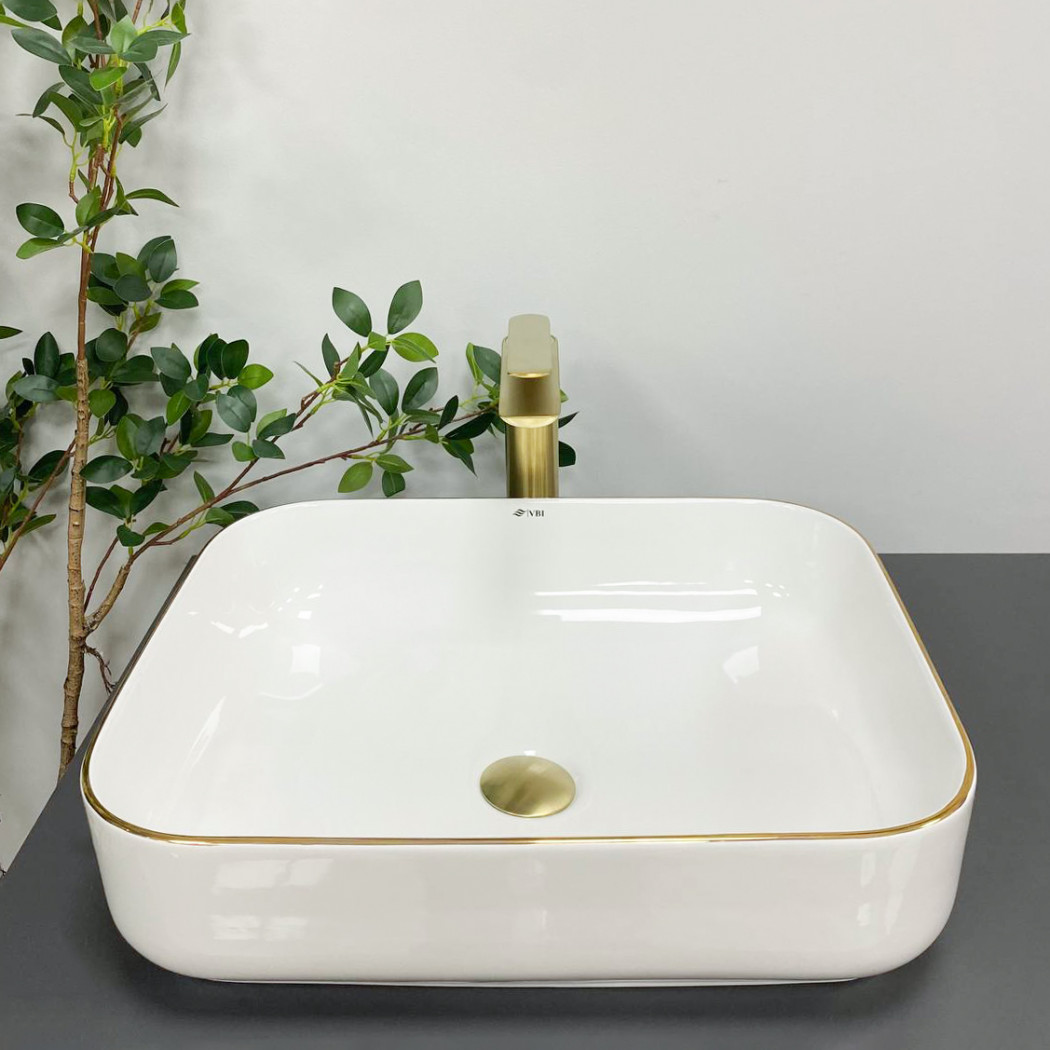 Накладные раковины серии VBI PALERMO пользуются высоким спросом и доступны в разных цветах в глянцевом и матовом исполнении. Классический дизайн с идеальной прямоугольной формой, смягчающийся скругленными углами и тонкими линиями - позволяет подобрать смеситель любой формы. Модель VBI PALERMO GOLD EDGE - имеет изящную окантовку золотого цвета.