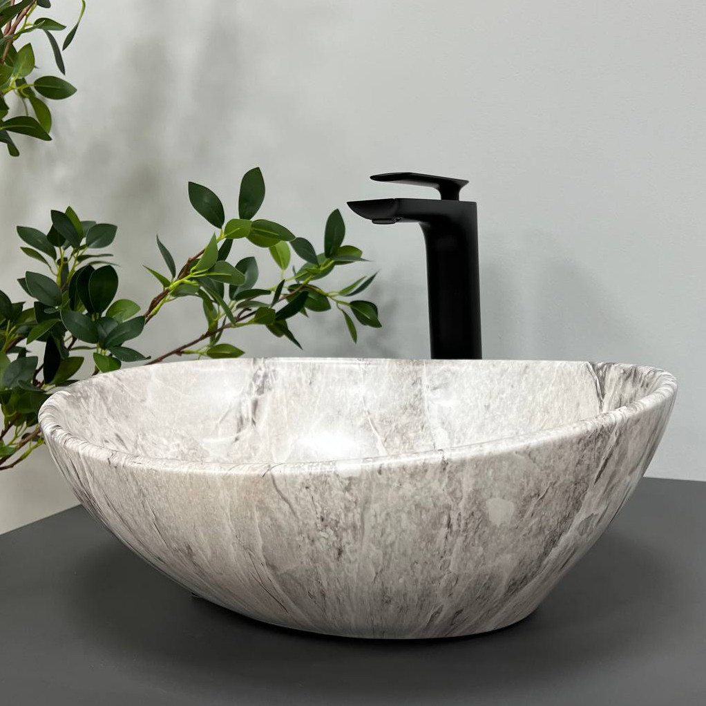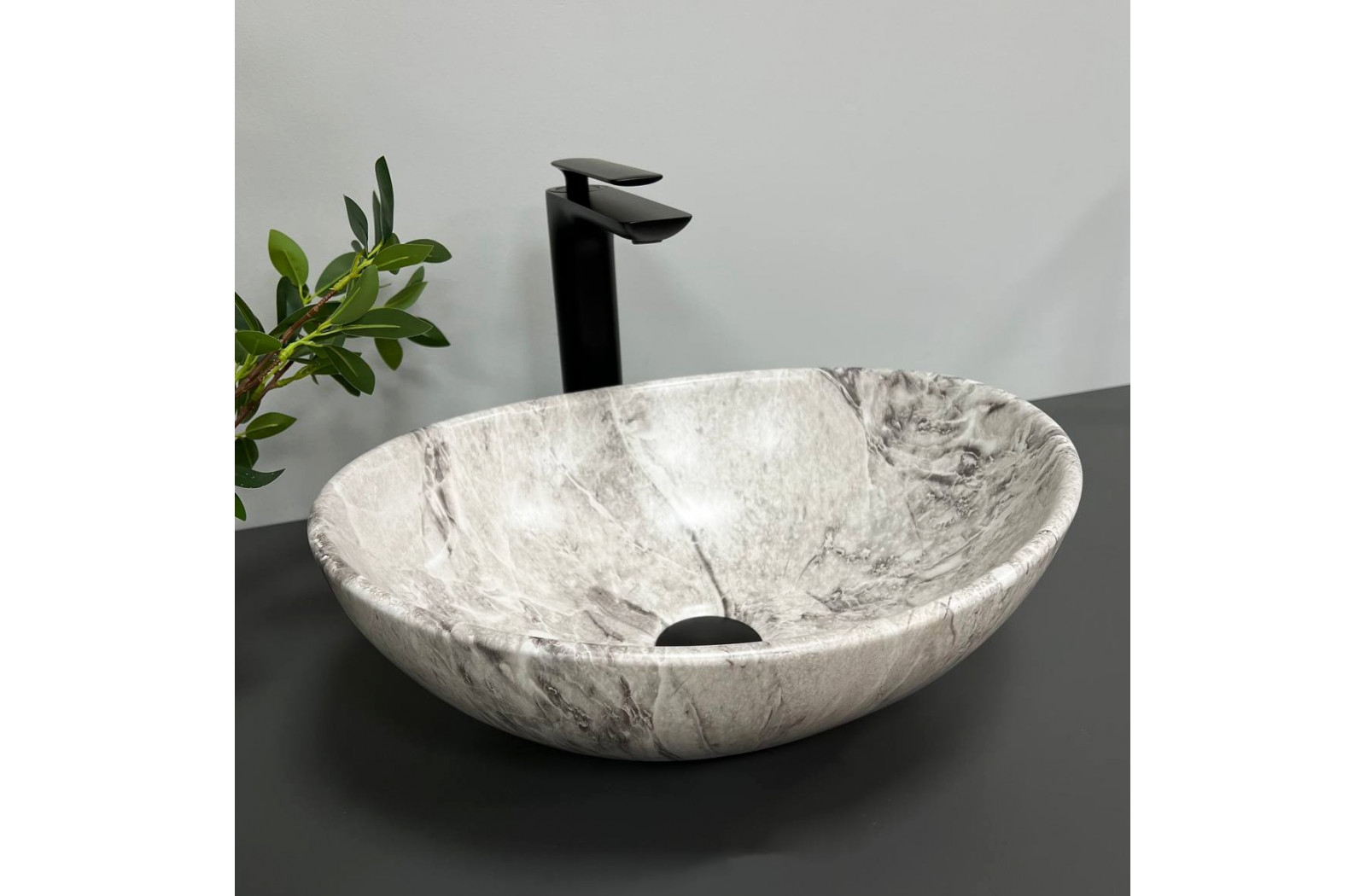 Накладные раковины серии VBI PARMA пользуются популярностью и предлагаются в разных цветах с глянцевым или матовым покрытием. Умывальник имеет классический и современный дизайн с овальной формой. Особенностью модели PARMA является широкий выбор узоров, имитирующих разные виды мрамора от нежных светлых оттенков до насыщенных зеленых и черных цветов, включая белоснежные глянцевые варианты.
