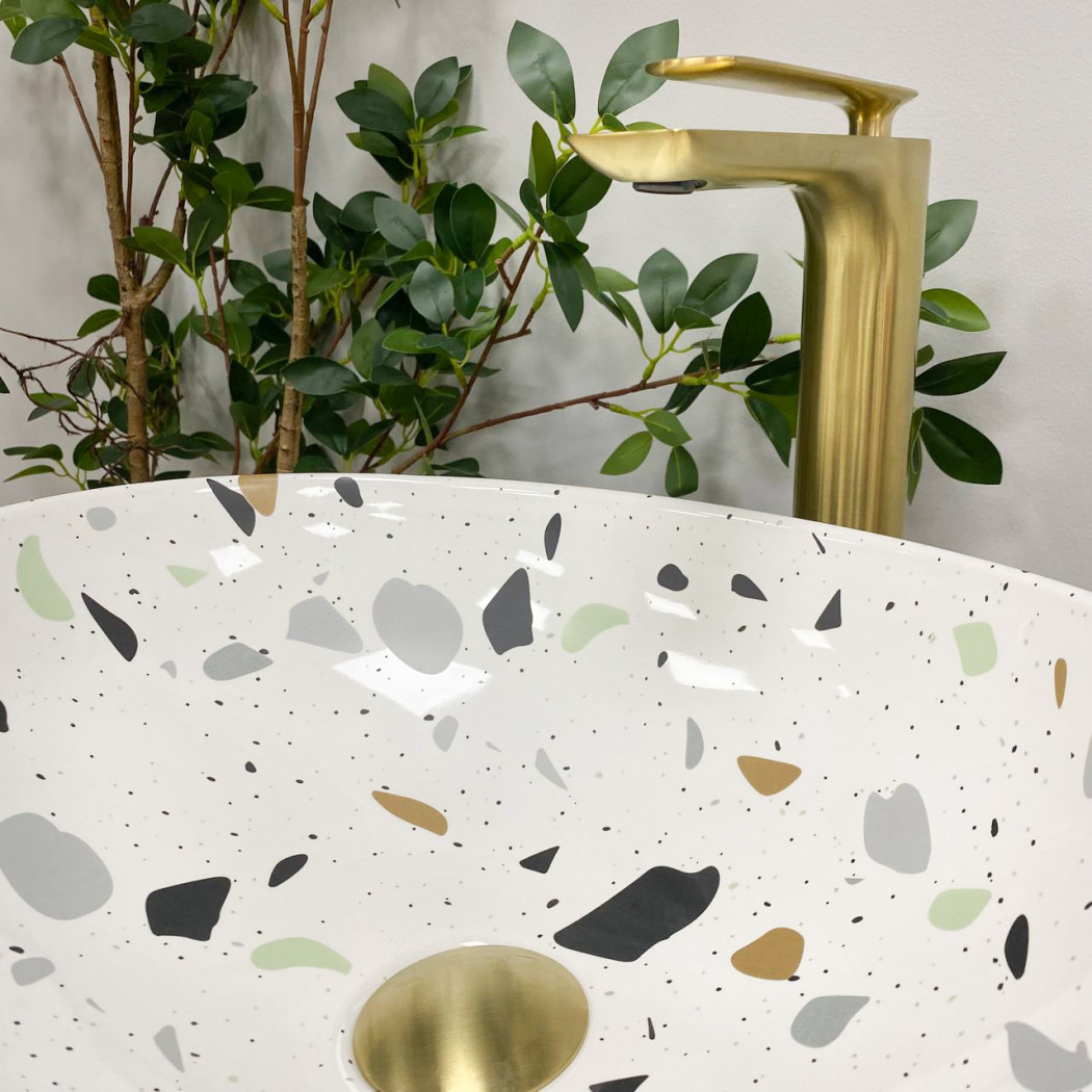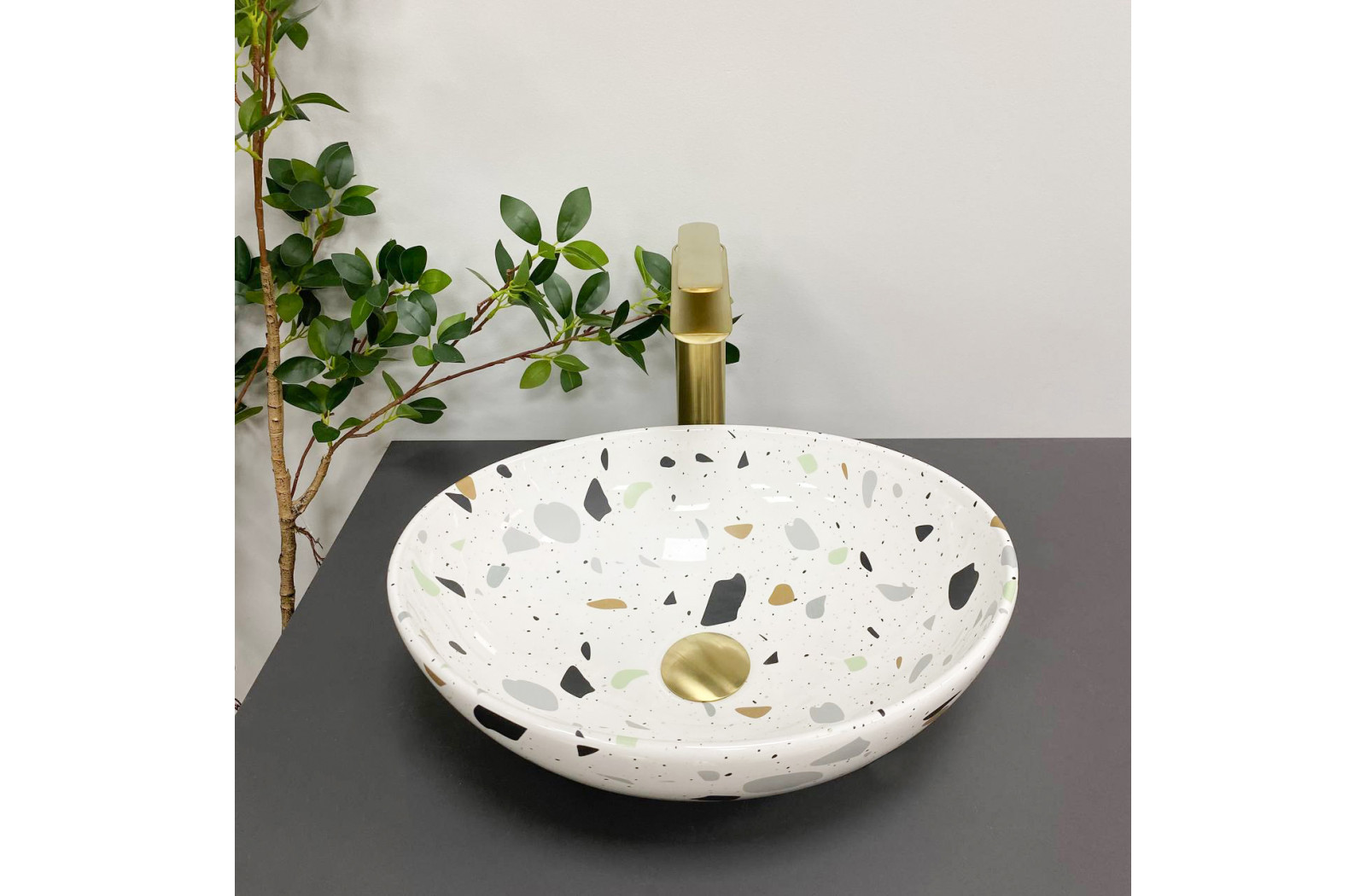 Накладные раковины серии VBI PARMA пользуются популярностью и предлагаются в разных цветах с глянцевым или матовым покрытием. Умывальник имеет классический и современный дизайн с овальной формой. Особенностью модели PARMA является широкий выбор узоров, имитирующих разные виды мрамора от нежных светлых оттенков до насыщенных зеленых и черных цветов, включая белоснежные глянцевые варианты. Модель VBI PARMA TERAZZO имеет уникальный узор. В основе есть белый цвет, украшенный хаотическими, цветными пятнышками это придает раковине яркий характер.