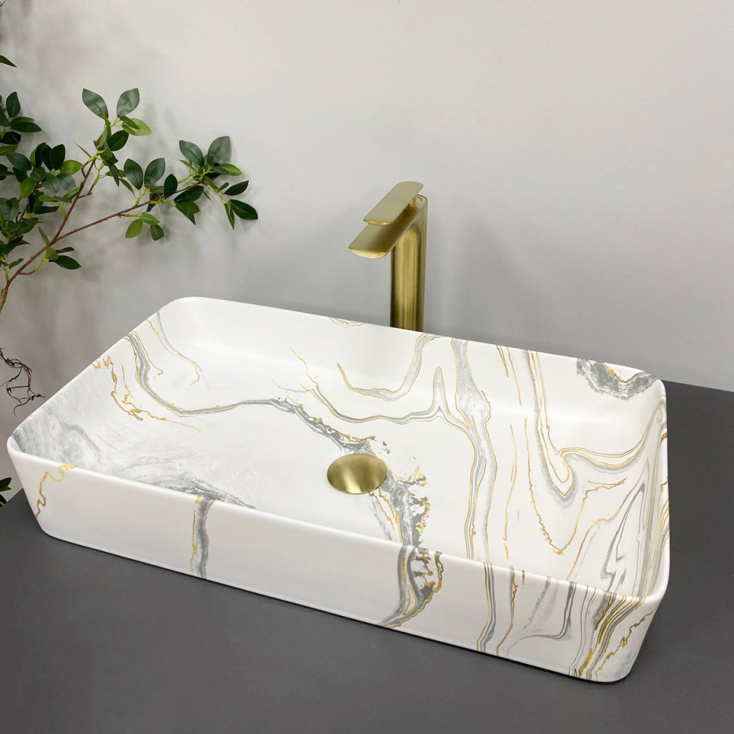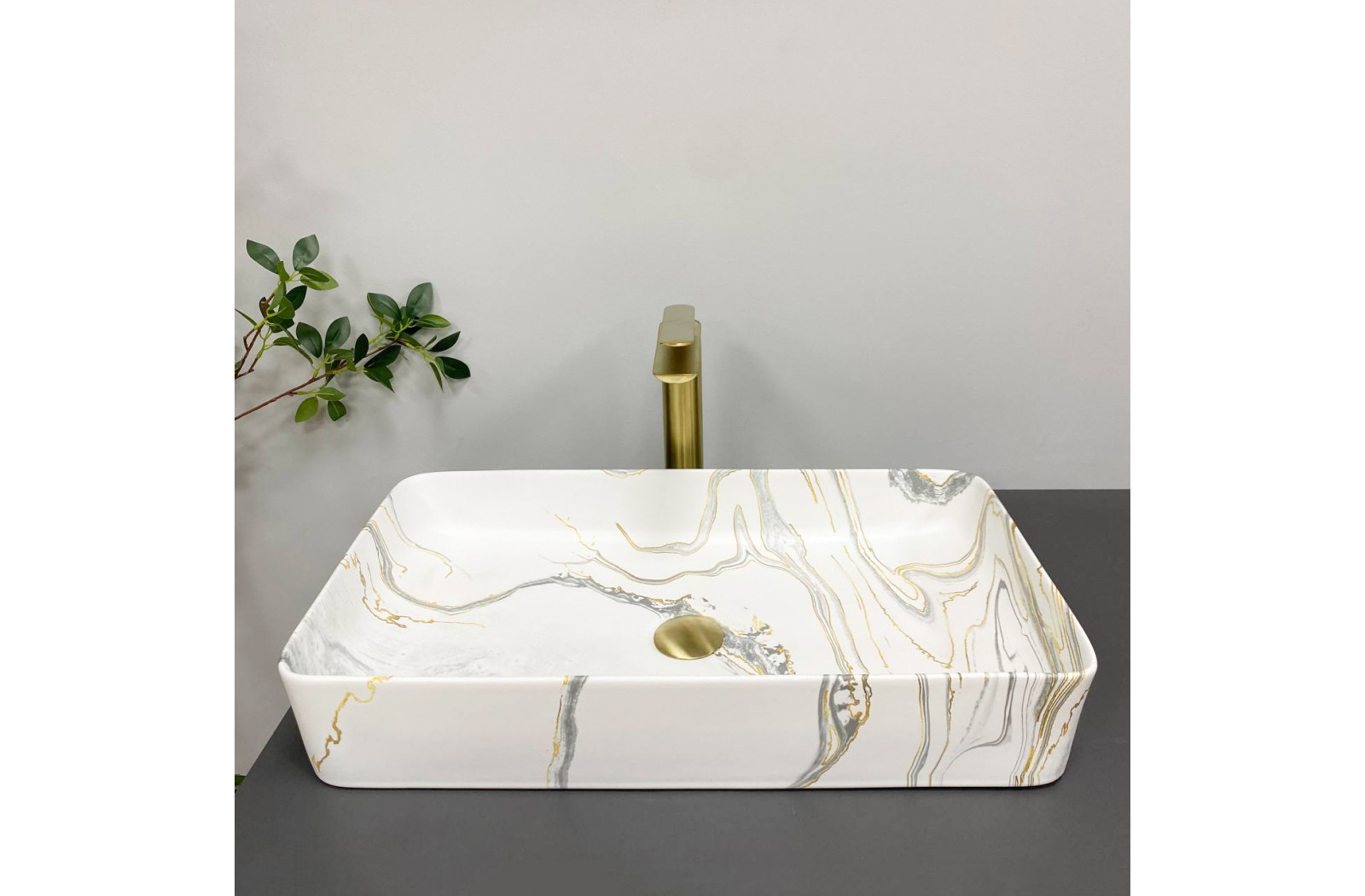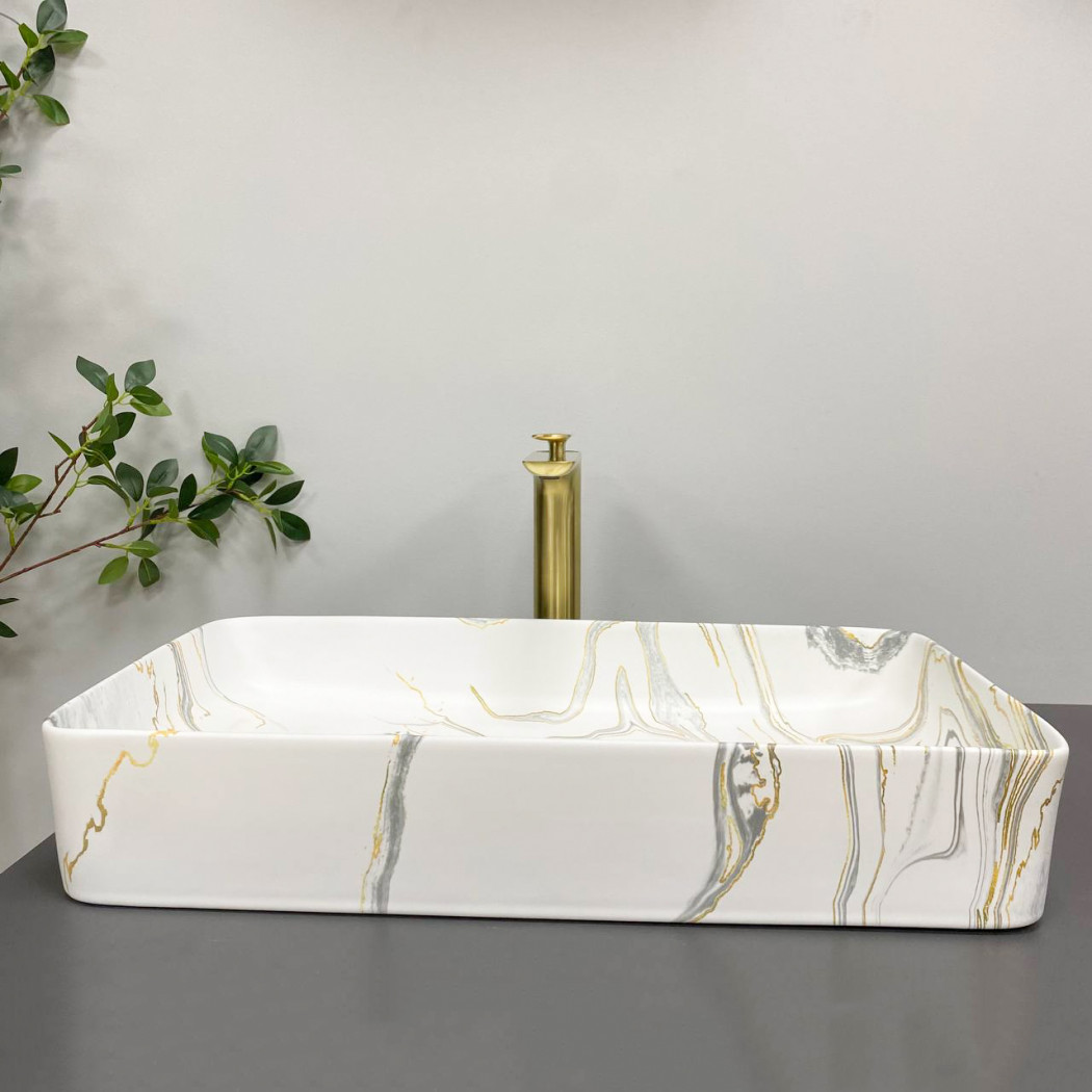 Накладные раковины серии VBI TRIEST - пользуются высоким спросом и доступны в разных цветах и размерах. Идеальная прямоугольная форма и прямые стенки, нарушенная легкими изгибами внутри - создают современный и классический вид. Предназначен для установки на столешницу. Модель VBI TRIEST STAINS – имеет уникальный узор.