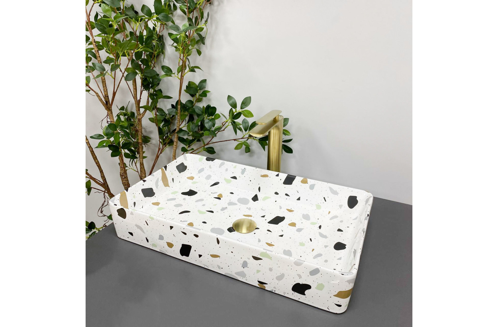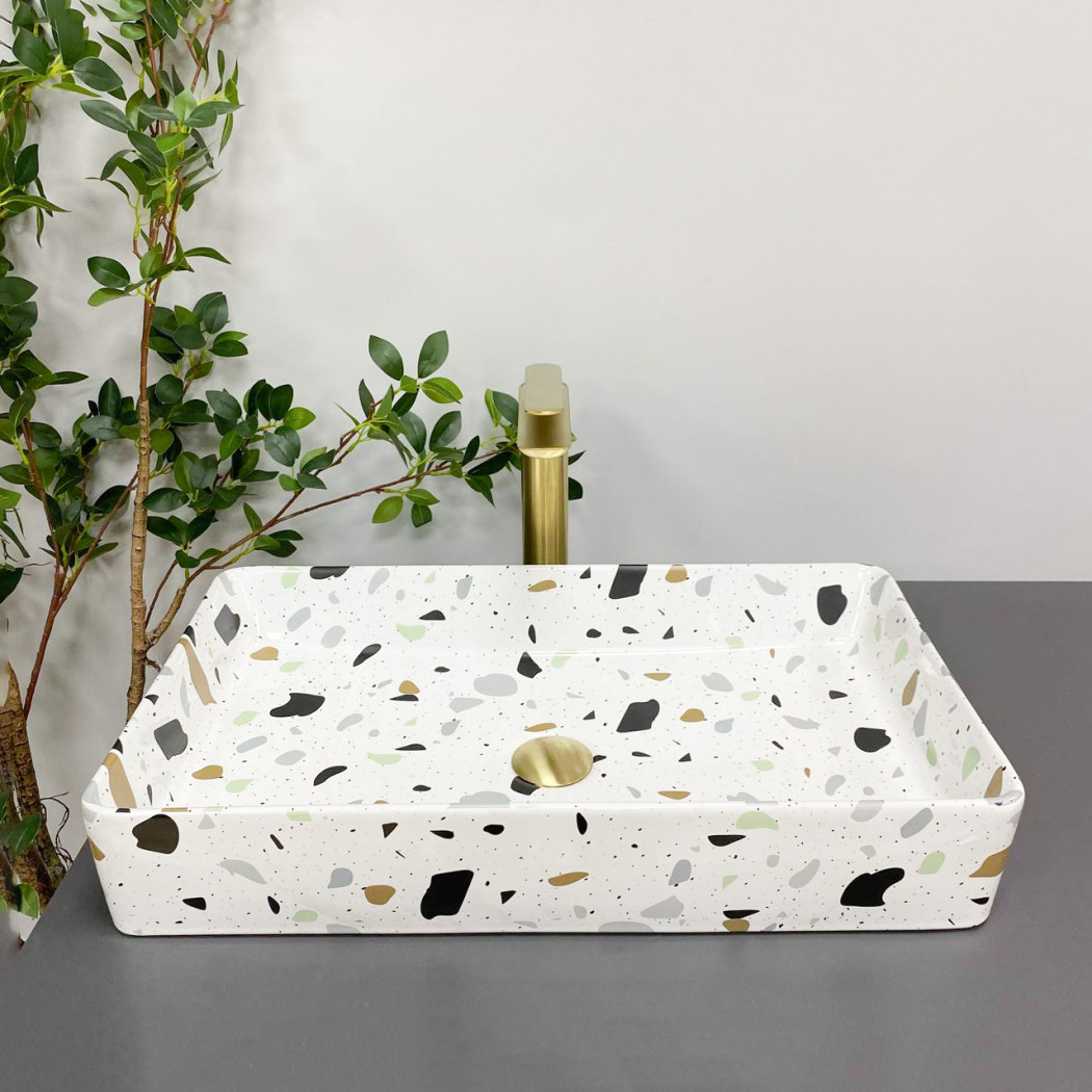 Накладные раковины серии VBI TRIEST пользуются высоким спросом и доступны в разных цветах и размерах, в глянцевом и матовом исполнении. Идеальная прямоугольная форма и прямые стенки, нарушенная легкими изгибами внутри, что создает современный и классический вид. Предназначен для установки на столешницу. Модель VBI TRIEST TERAZZO – имеет уникальный узор. В основе есть белый цвет, украшенный хаотическими, цветными пятнышками, это придает раковине яркий характер.