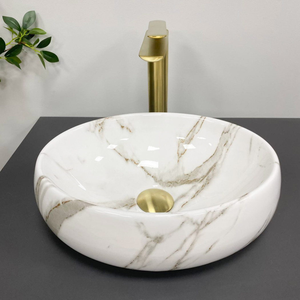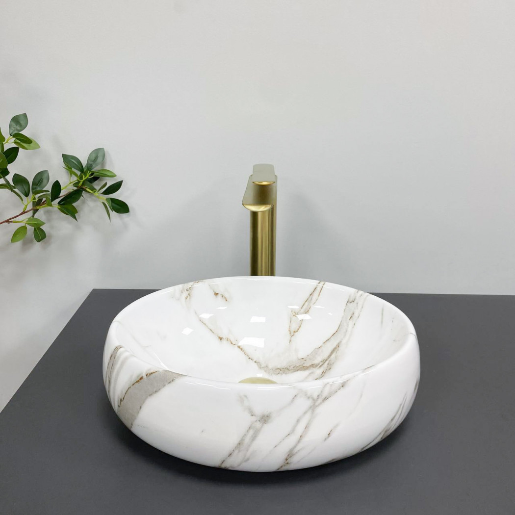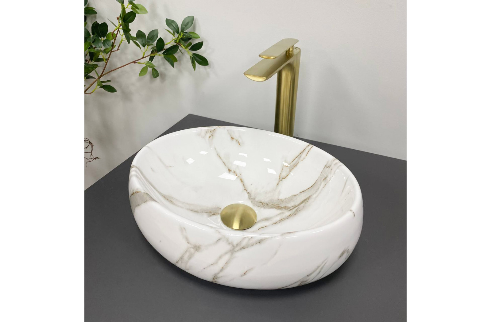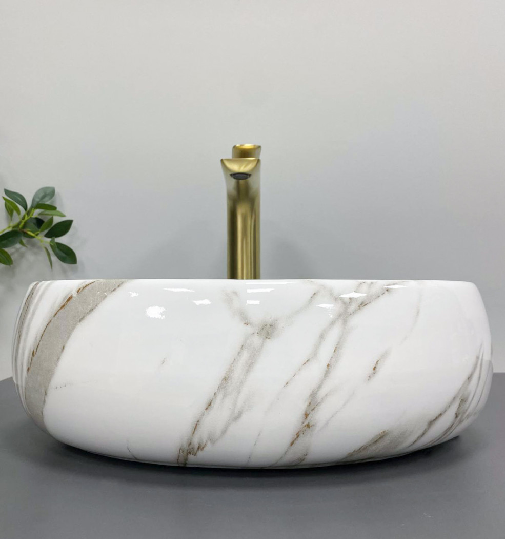Накладные раковины серии VBI VENETO пользуются высоким спросом и доступны в разных размерах и цветах в глянцевом или матовом исполнении. Накладная по способу установки раковина имеет овальную форму с округленными стенками наружу, что полностью довершает дизайн. Модель VBI VENETO AIAX – выполнена с неповторимым узором, имитирующим мрамор с глянцевым покрытием.