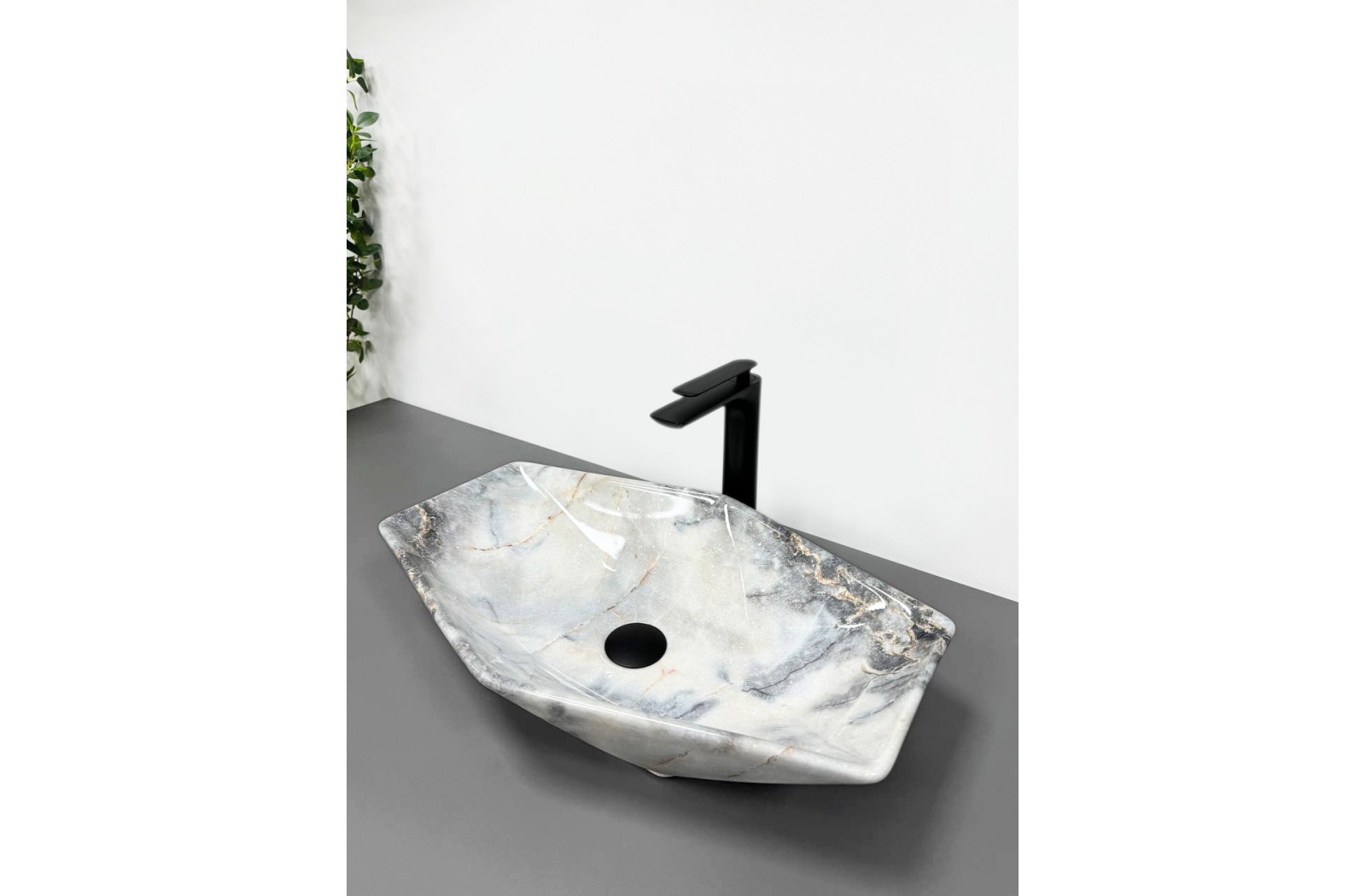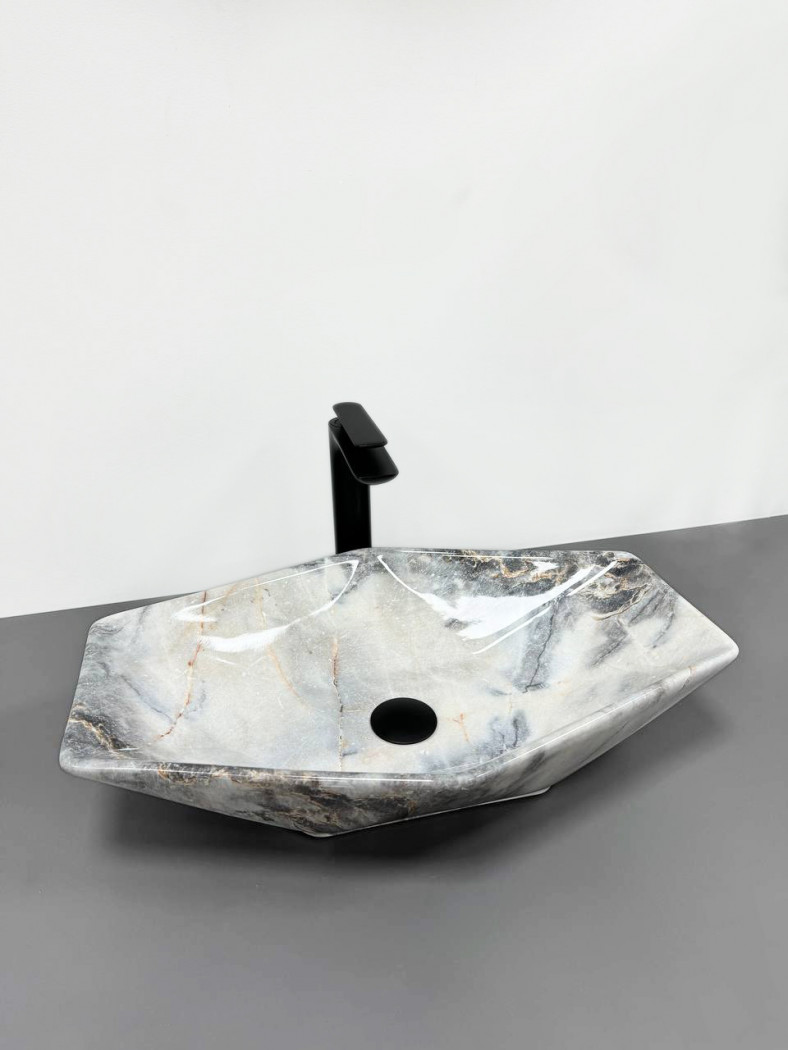 Накладные раковины из серии VBI VENEZIA пользуются высоким спросом и доступны в разных размерах и цветах в глянцевом или матовом исполнении. Раковина создана по современным трендам с уникальным дизайном в стиле Low Poly. У нее нестандартная форма плотно расположенных геометрических фигур, хорошо играющих на свете. Накладная по способу установки раковина, позволяет легко подобрать смеситель в любом стиле.