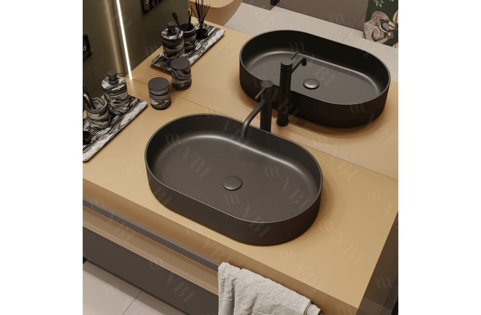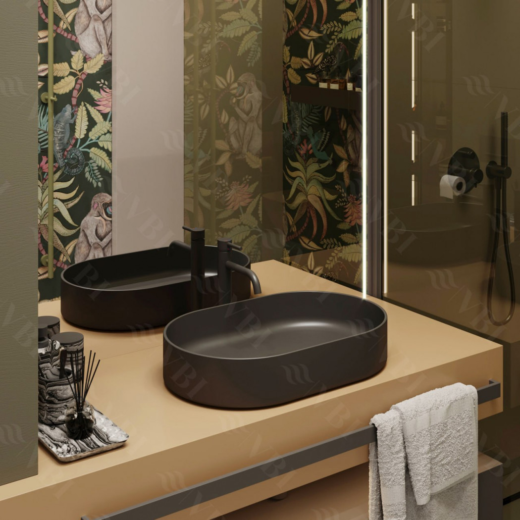 Накладные раковины серии VBI VERONA пользуются высоким спросом и доступны в разных размерах и цветах в глянцевом или матовом исполнении. Накладная по способу установки раковина имеет классическую овальную форму с четкими линиями. Это позволяет подобрать смеситель, как круглой, так и квадратной формы. Модель VBI VERONA 60 BLACK – имеет трендовый черный цвет, а матовое покрытие придает общий шарм.