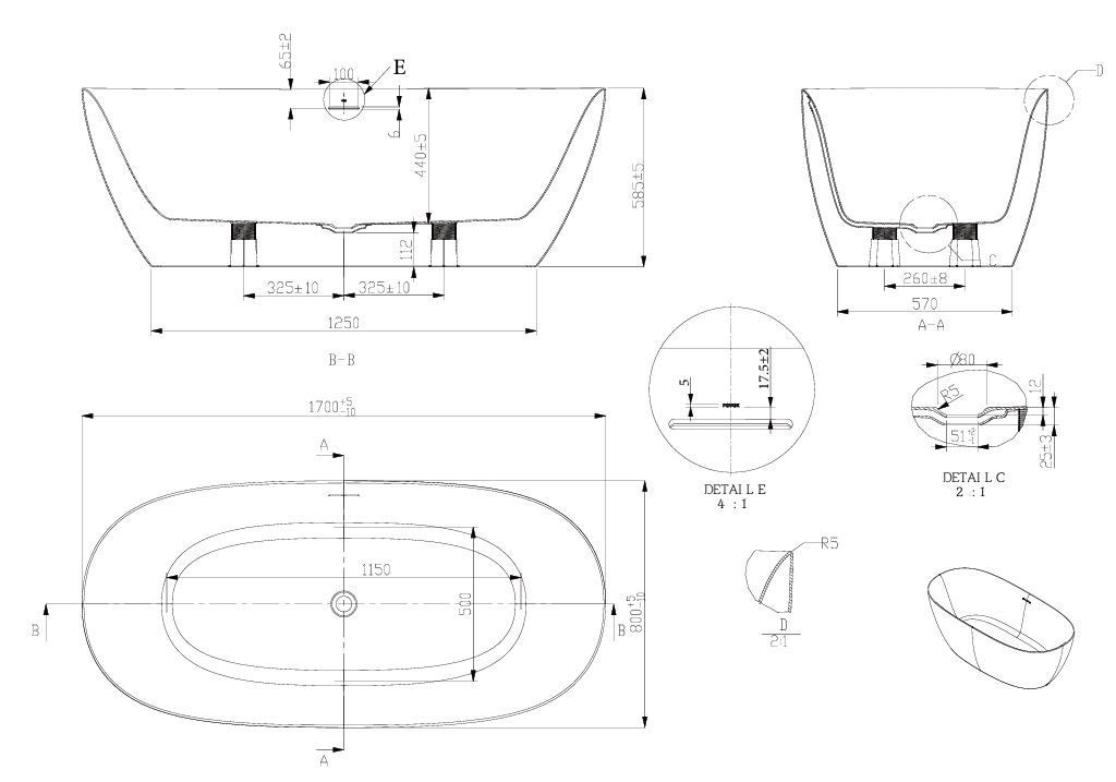 Завдяки розмірам 1700×800 мм ванна забезпечує достатньо простору для зручного відпочинку, а її окремостояча конструкція дозволяє встановити її як у центрі приміщення, так і біля стіни, залежно від дизайнерського рішення.